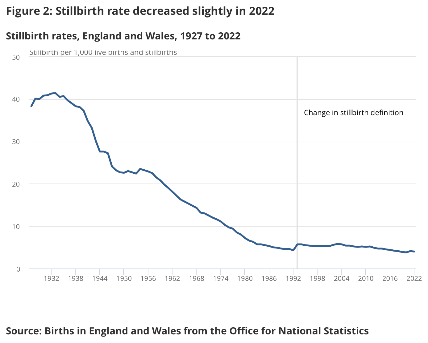 I told her that the ONS bulletin "Births in England and Wales: 2022" includes this plot of stillbirths and live births going back to 1927, even though the historical data was omitted from the 2023 and 2024 editions: [https://ons.gov.uk/peoplepopulationandcommunity/birthsdeathsandmarriages/livebirths/bulletins/birthsummarytablesenglandandwales/2022]