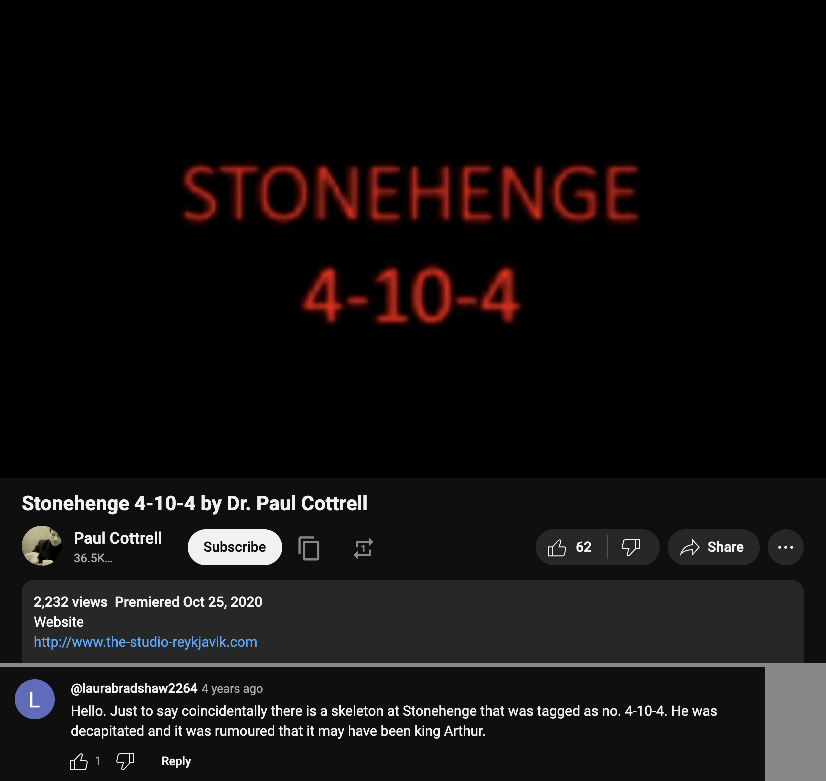 In addition to the Cicada 3301 video, Cottrell also posted another cryptic video in October 2020, which only consists of text that says "STONEHENGE 4-10-4" and no audio. [https://www.youtube.com/watch?v=4oEBLAuVRj0] A user called laurabradshaw2264 posted this comment to the video: "Hello. Just to say coincidentally there is a skeleton at Stonehenge that was tagged as no. 4-10-4. He was decapitated and it was rumoured that it may have been king Arthur." It sounds like something from a Cicada puzzle, because they involve historical artifacts or themes like the Grail legend: