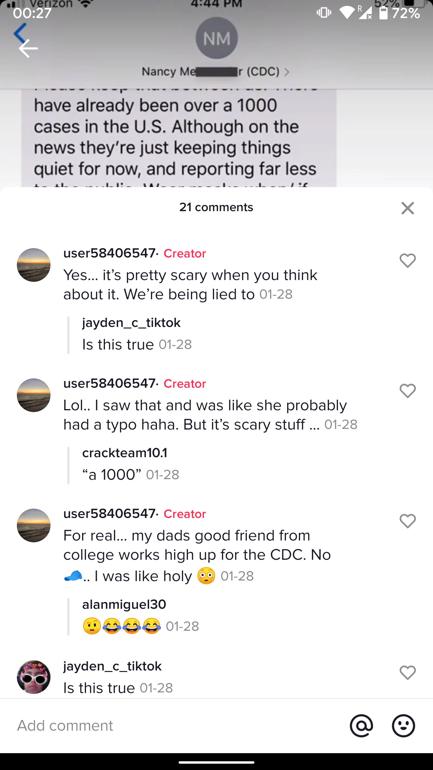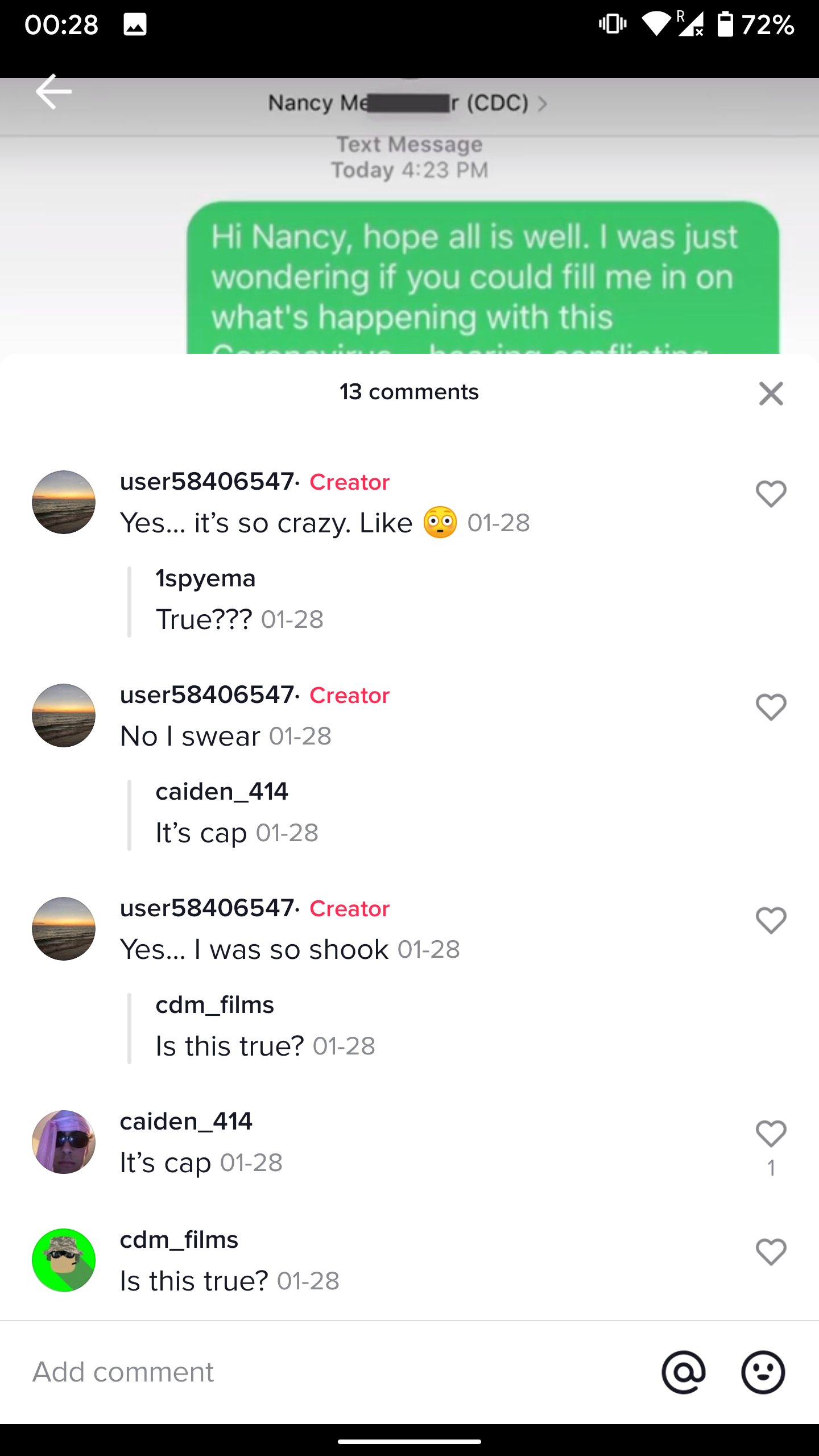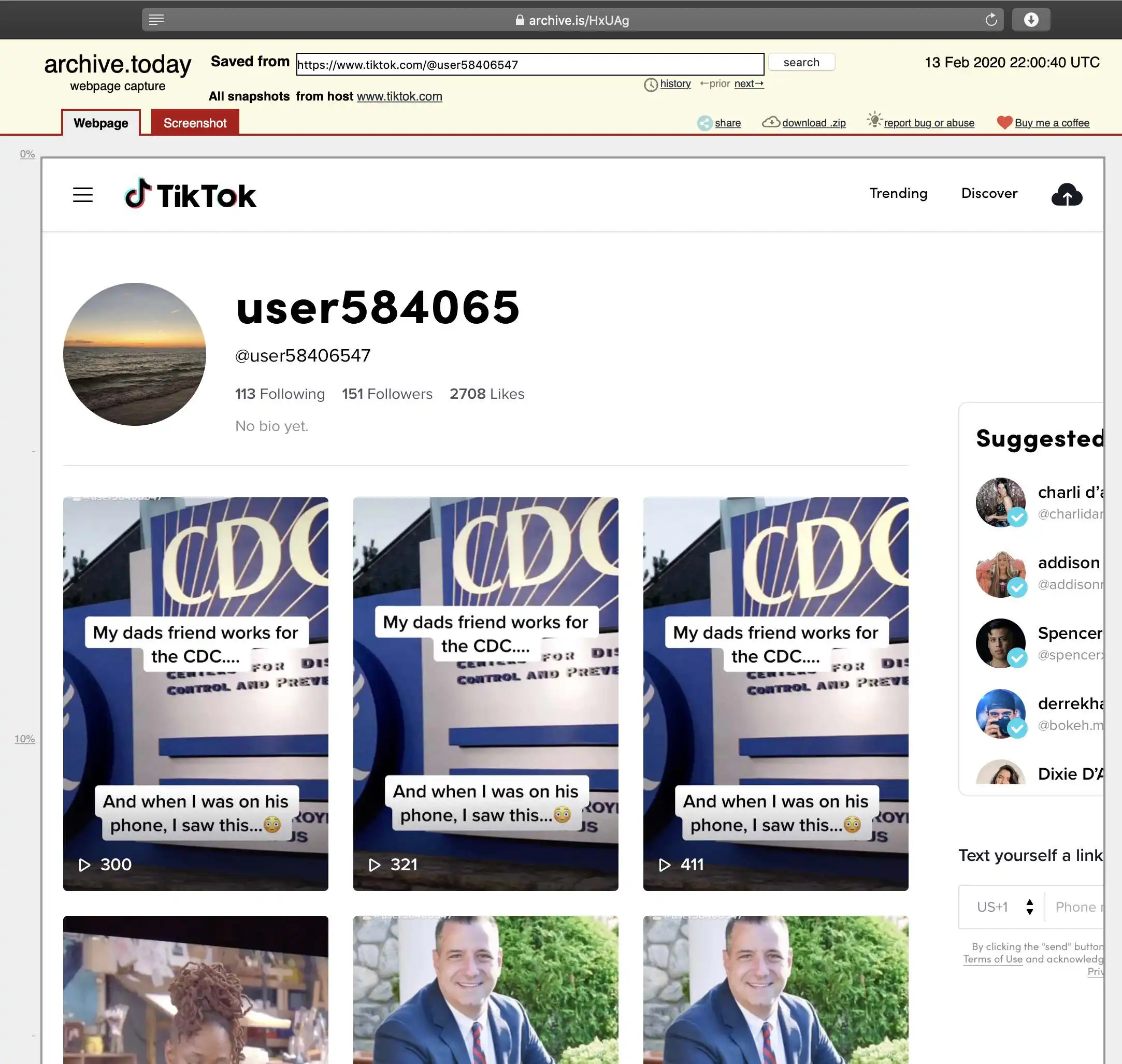 Even earlier on January 27th 2020 UTC, the same screenshots were posted on TikTok by a user named user58406547: [http://web.archive.org/web/20200226155731/https://www.tiktok.com/@user58406547]