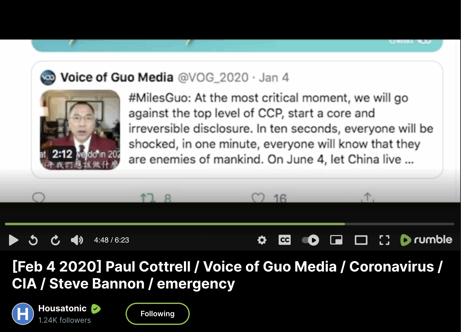 On February 4th 2020, Paul Cottrell did a short video where he showed the tweet below by Voice of Guo Media, and he claimed it contained a hidden message which showed that the coronavirus pandemic was part of a secret CIA operation to take down the CCP. He said: "This is code. This is a CIA code for an operation. And what's happening is you take six for June 4th, 2020, okay. Cause that's the date that he's mentioning. Take the six for June divided by two, you get three. You take the four for the date divided by two, you get two. You take 2020, which is two plus zero plus two plus zero is four. Divide it by two, it's two. When you take those answers from those ratios, it adds to three, it makes three, two, two. That is the sign. That's the code that the CIA operation is happening. There is a takedown of the CCP and this was the launch code, or the operational code, or whatever you want to call it in the military, but this is it. Save this video and share it. It's - blitz the internet, it's gotta be blitzed. Anyone that's in IT, you can 4chan it, get it on, you know, everything, it has to be blitzed, everything." [https://rumble.com/v6eic01-feb-4-2020-paul-cottrell-voice-of-guo-media-coronavirus-cia-steve-bannon-em.html]