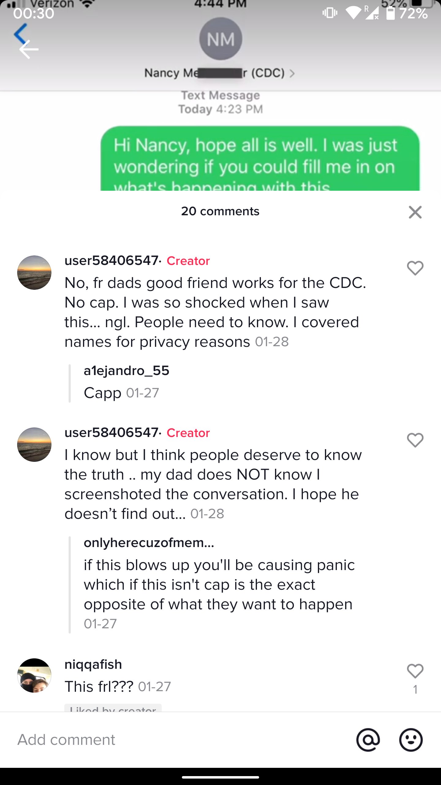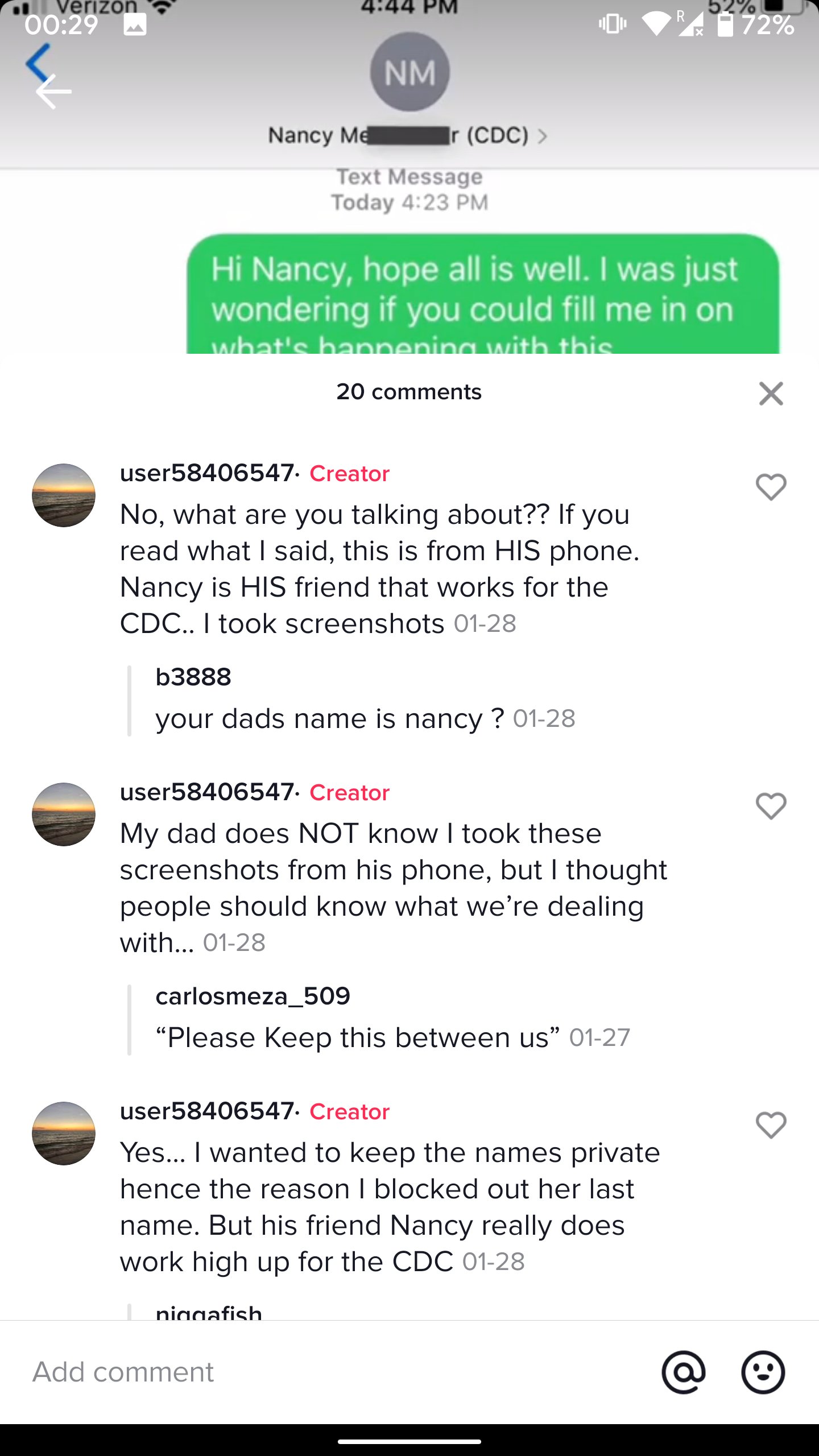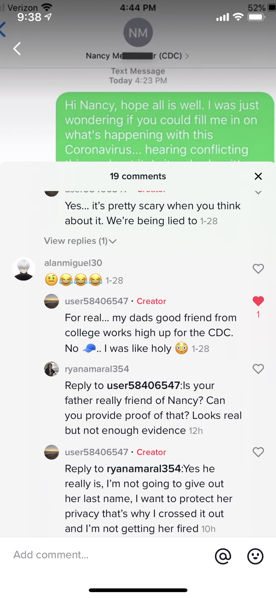 According to an 18 year old in upstate New York near Schenectady, his father had a text messaging exchange with Doctor Nancy Messonnier, the Director of the Center for the National Center for Immunization and Respiratory Diseases (NCIRD) within the Centers for Disease Control (CDC), photo below.