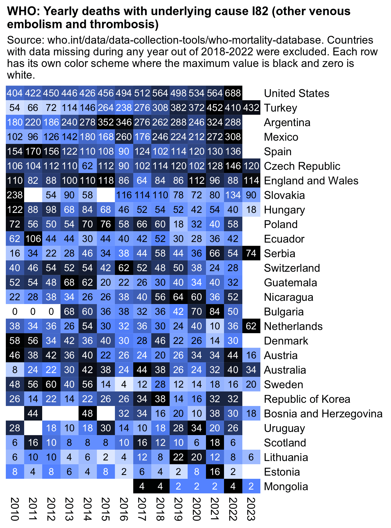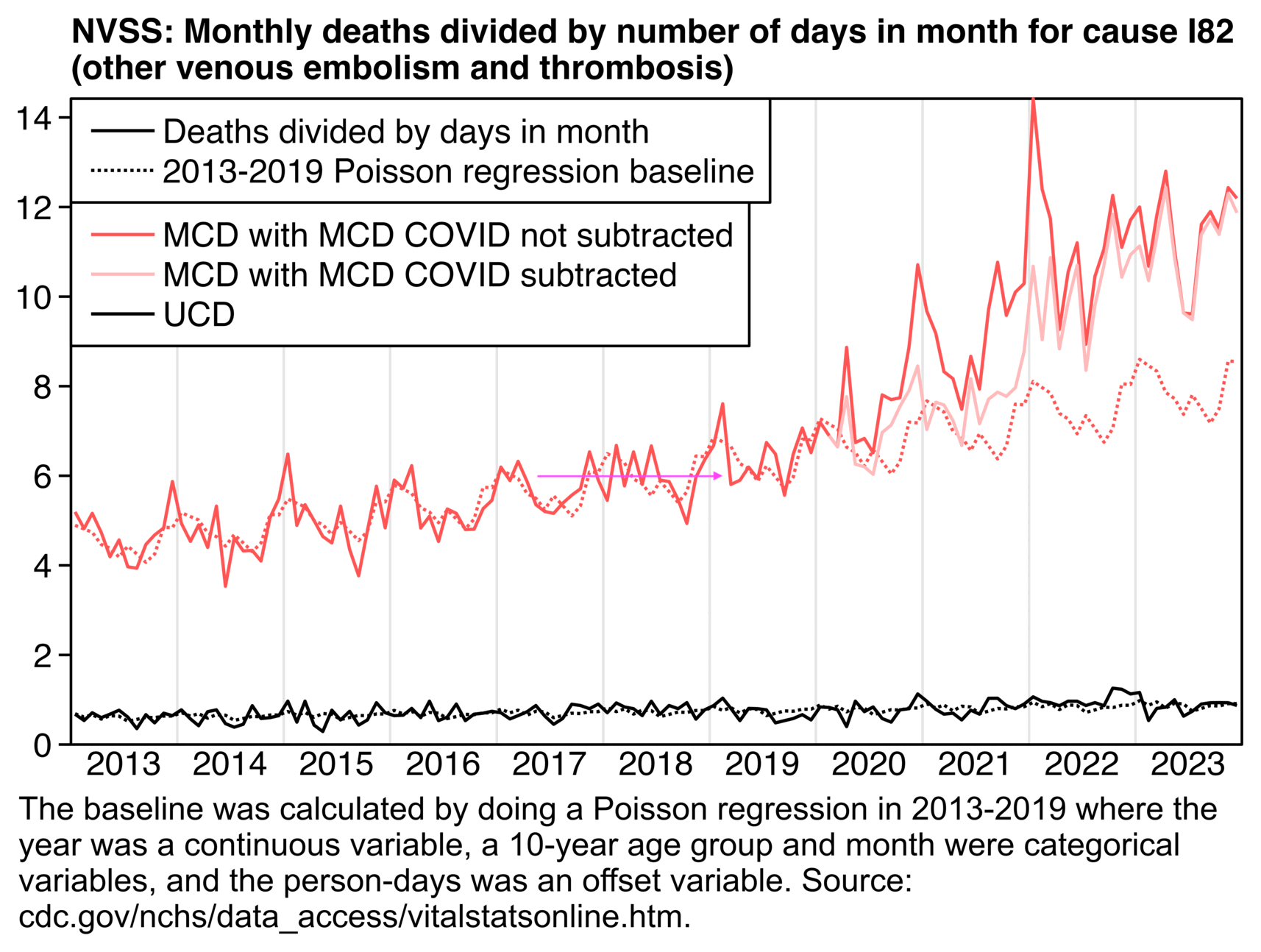 The reason why Ethical Skeptic got relatively high excess deaths in 2023 compared to 2022 might be if he fitted the baseline against data from only 2018 and 2019 as is demonstrated by my plot below. My plot also shows that the number of deaths under his ICD codes had a sudden jump up at the start of 2011 and a sudden jump down at the start of 2013, which may have been due to changes in coding practices. So the increase in deaths since 2020 might have similarly been due to changes to coding practices, because its magnitude is similar to the magnitude of the drop between 2012 and 2013: