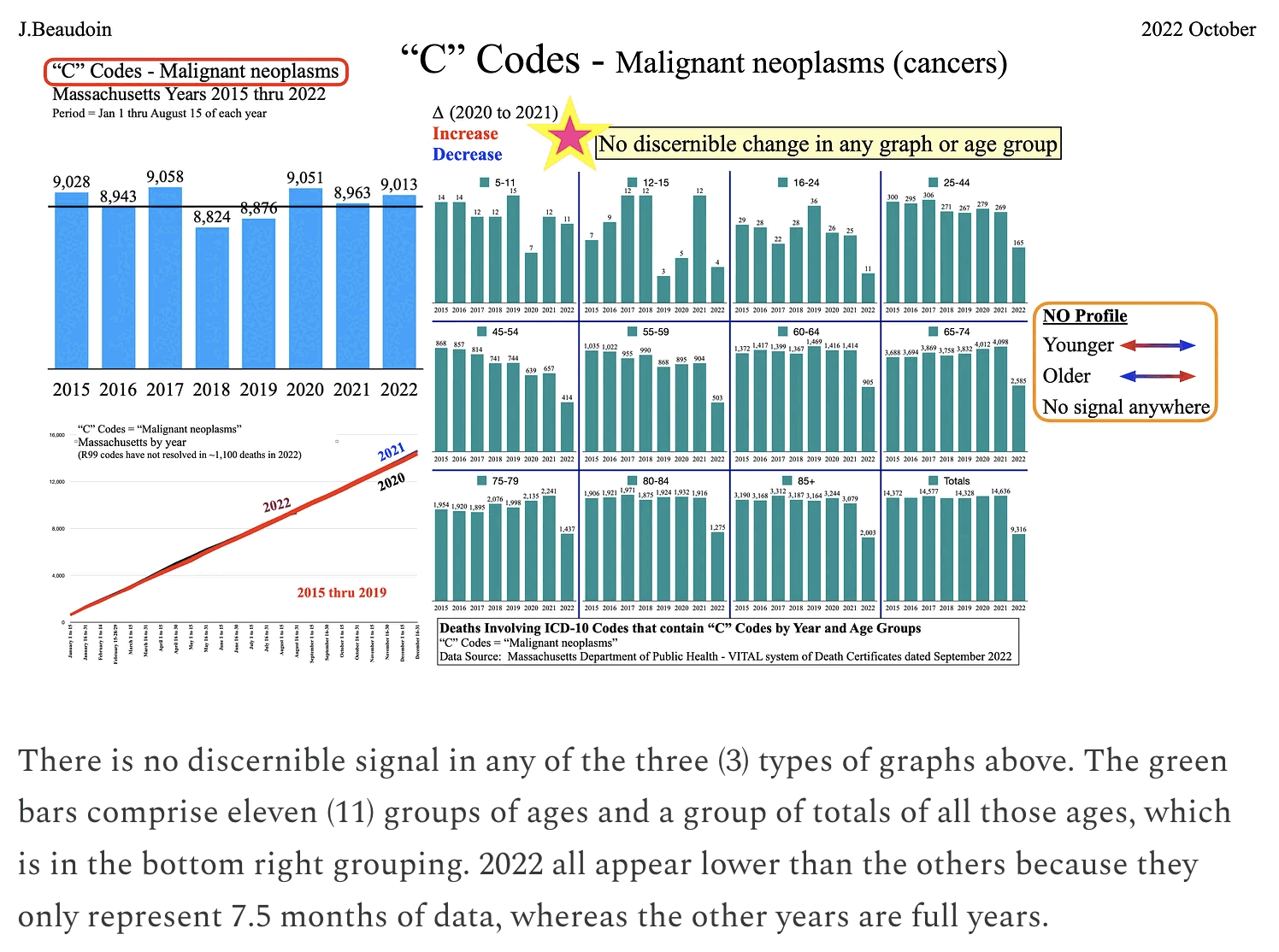 Beaudoin almost never makes plots of overall cancer mortality, but he only cherrypicks codes like C77.9 for subtypes of cancer that have gone up since 2020. But in 2022 he made these plots of deaths from all malignant neoplasms combined, and he wrote that there was no discernible signal of excess deaths: [https://therealcdc.substack.com/p/hidden-cancer-signals-found]