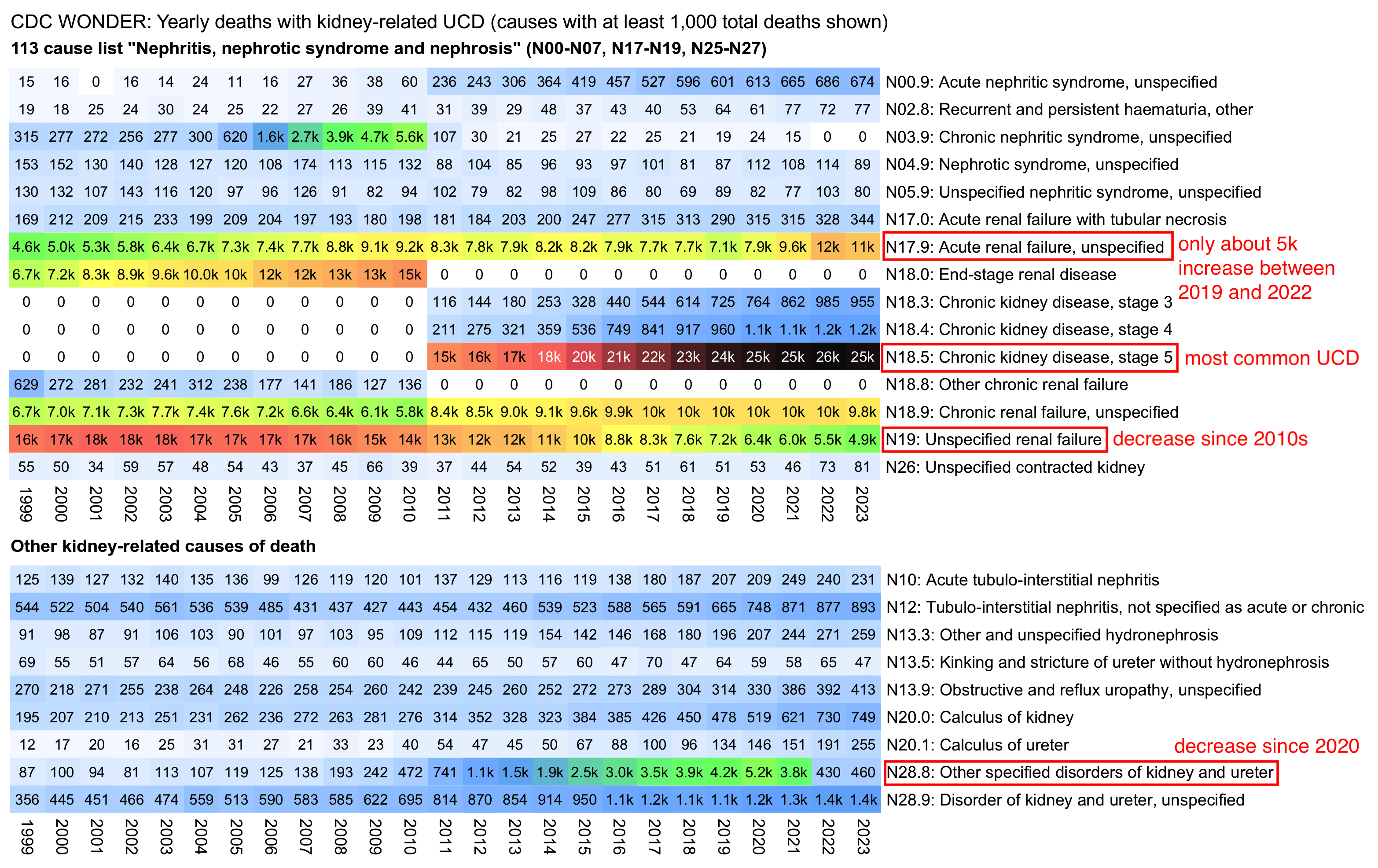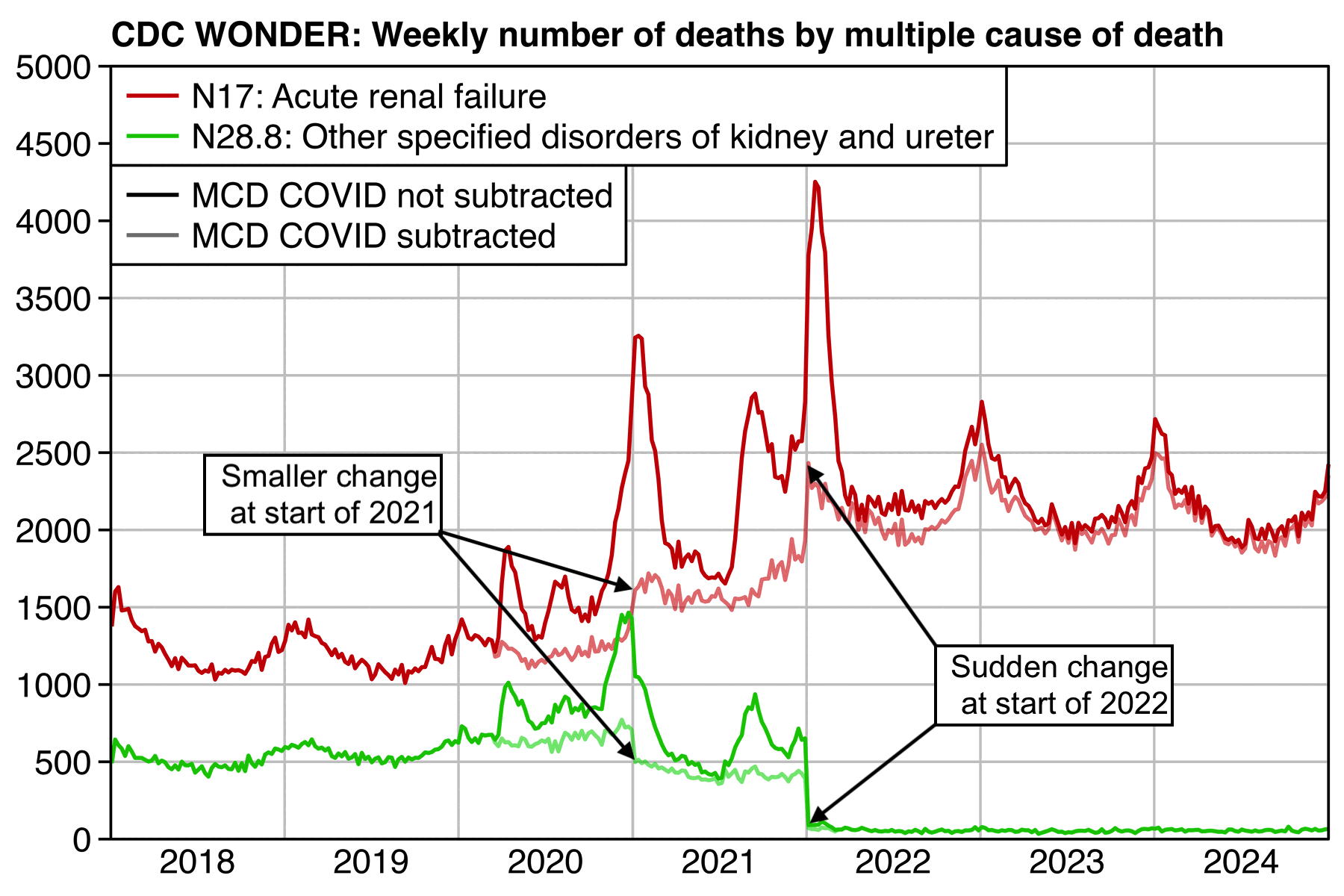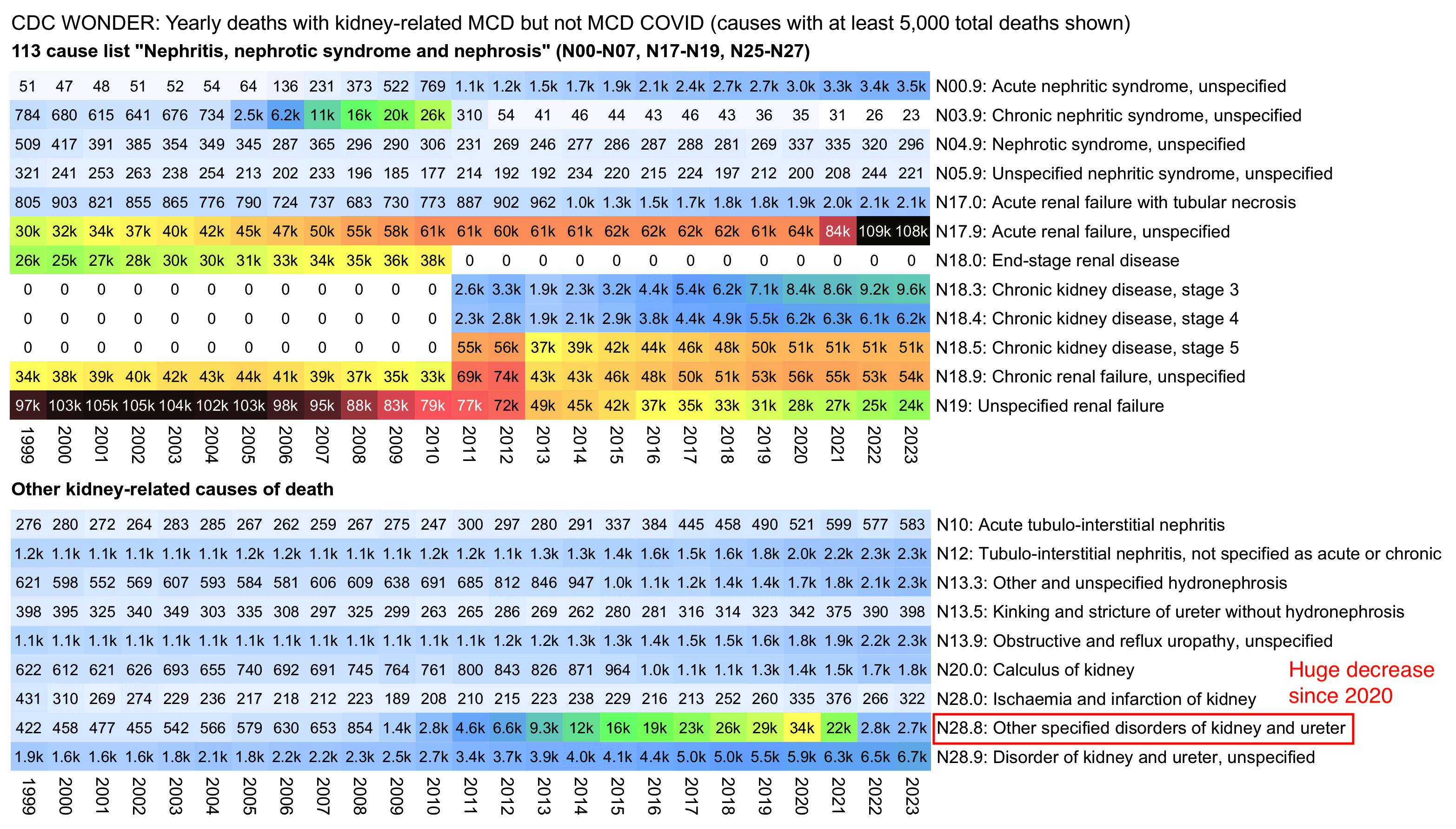 The ICD codes in Ethical Skeptic's plot are the same codes that are included on the ICD 113 cause list under the label "Nephritis, nephrotic syndrome and nephrosis". Most of the increase under the label since 2020 is accounted by N17.9 (acute renal failure, unspecified). However the label is missing N28.8 (other specified disorders of kidney and ulcer) which has had a massive decrease since 2020 that has coincided with the increase in N17.9: