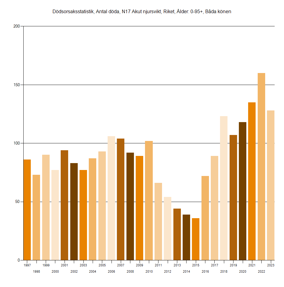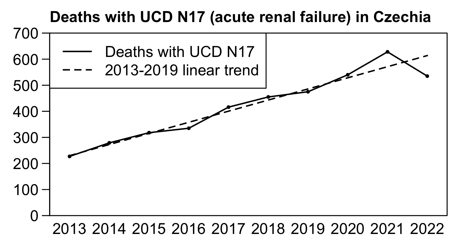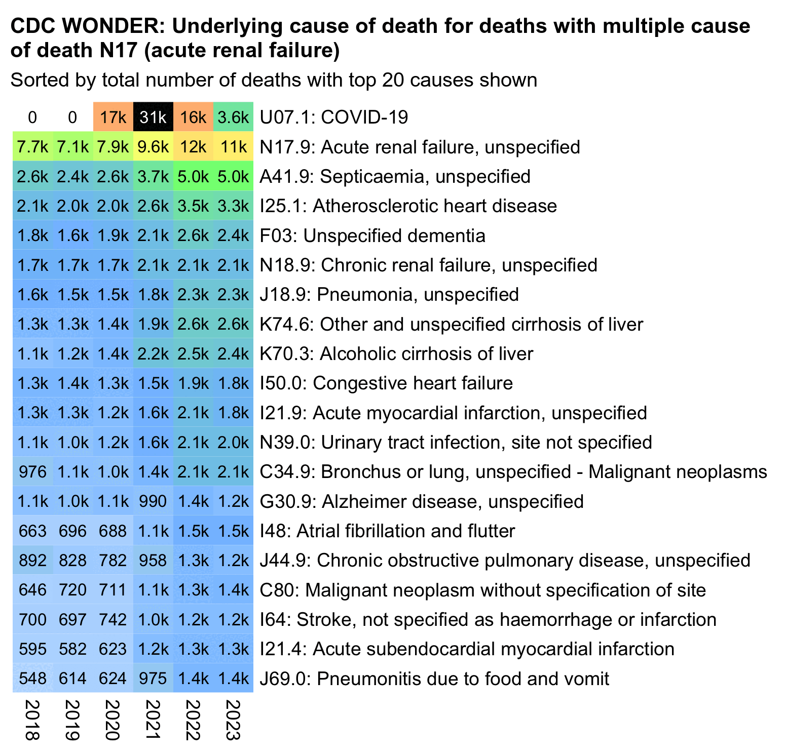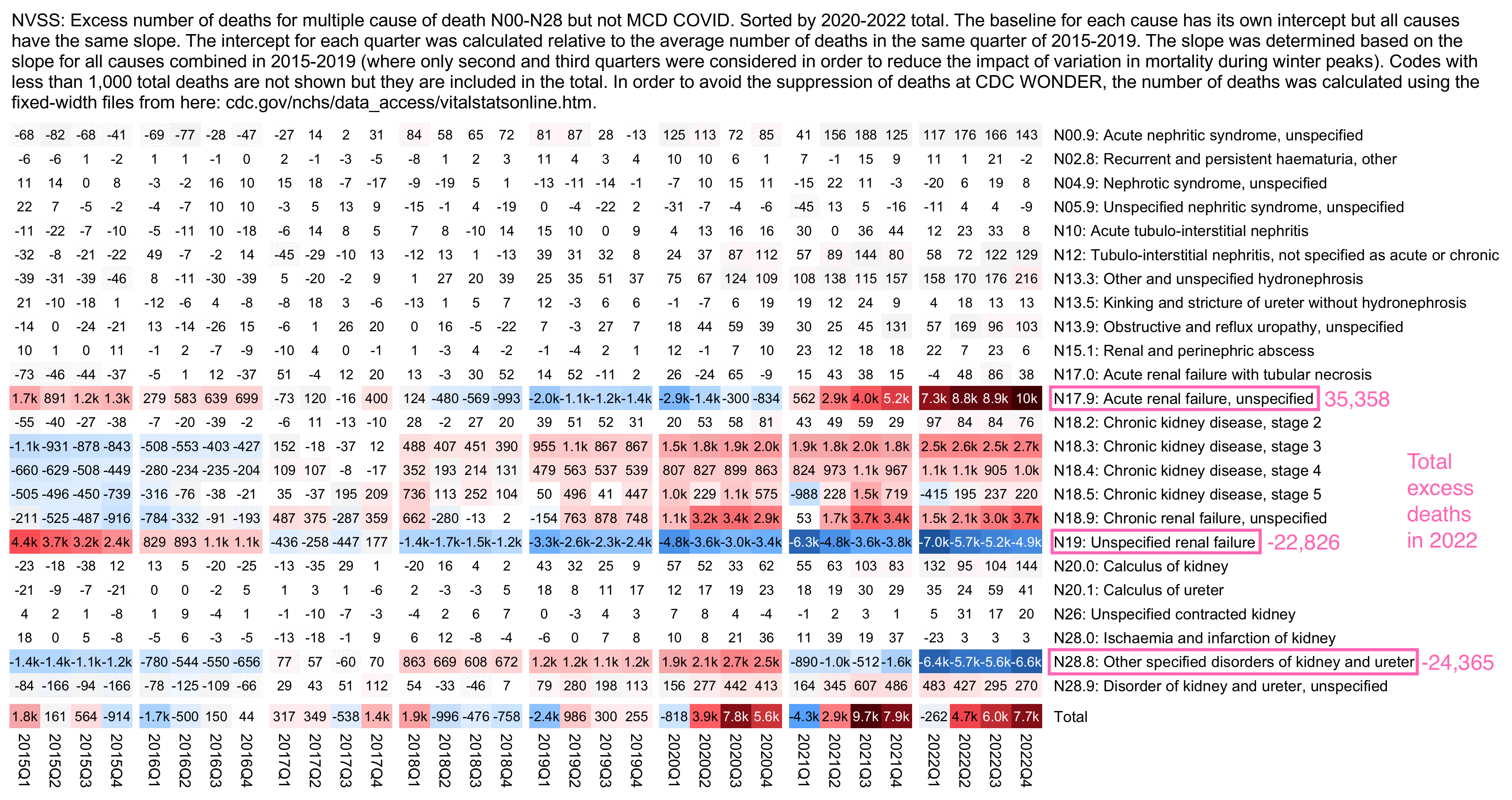 The ICD codes in Ethical Skeptic's plot are the same codes that are included on the ICD 113 cause list under the label "Nephritis, nephrotic syndrome and nephrosis". Most of the increase under the label since 2020 is accounted by N17.9 (acute renal failure, unspecified). However the label is missing N28.8 (other specified disorders of kidney and ulcer) which has had a massive decrease since 2020 that has coincided with the increase in N17.9: