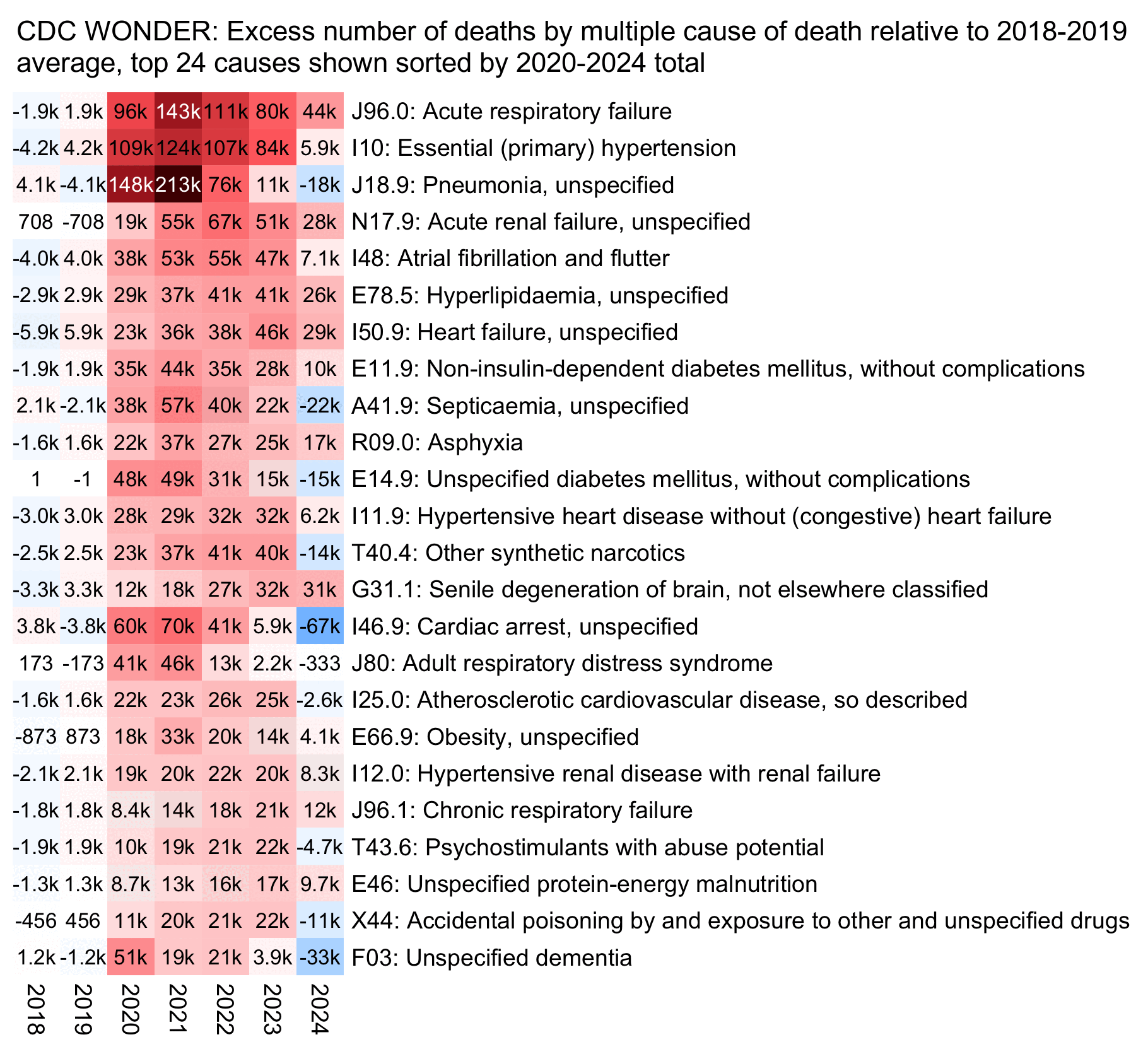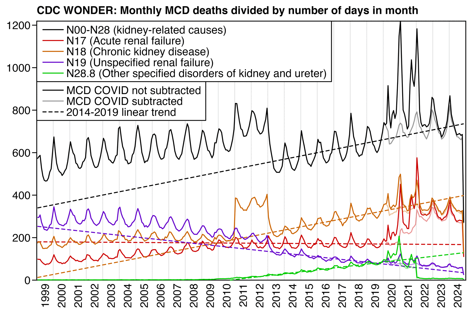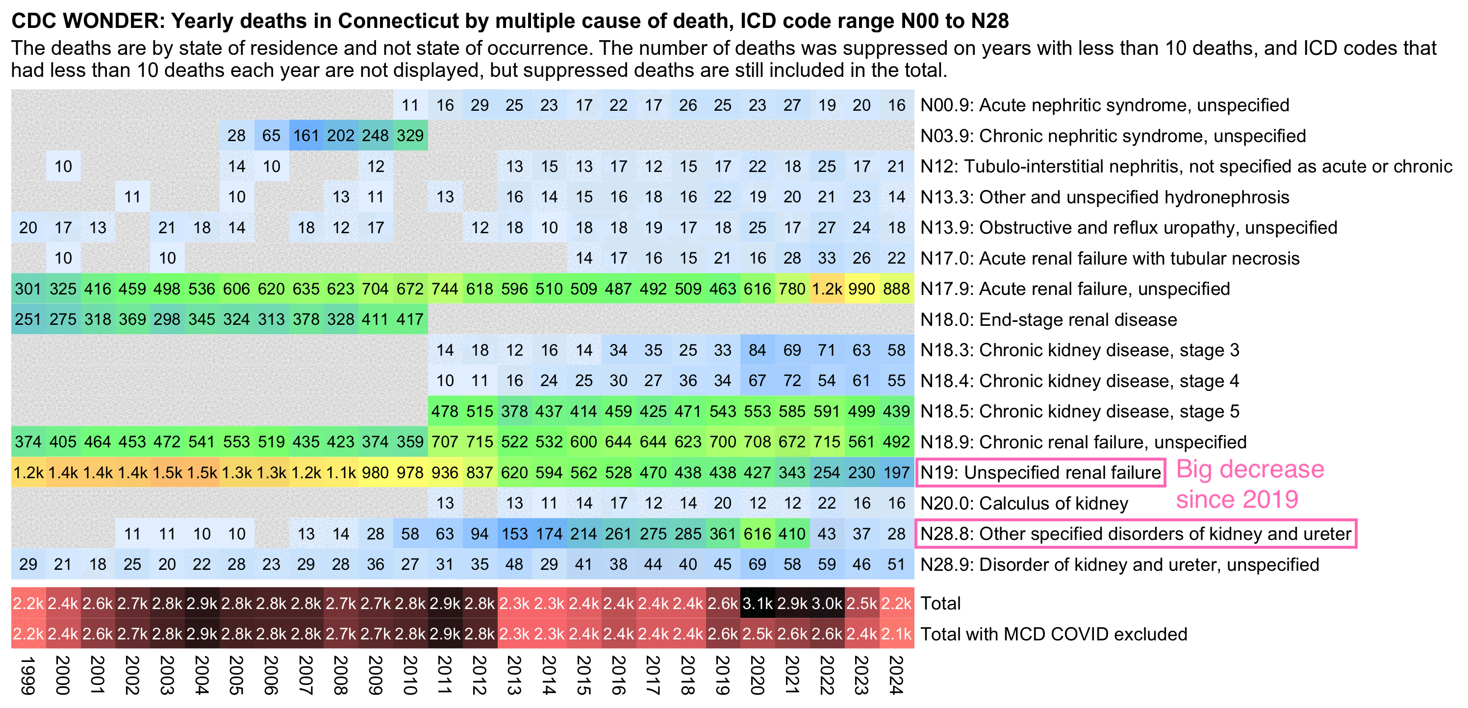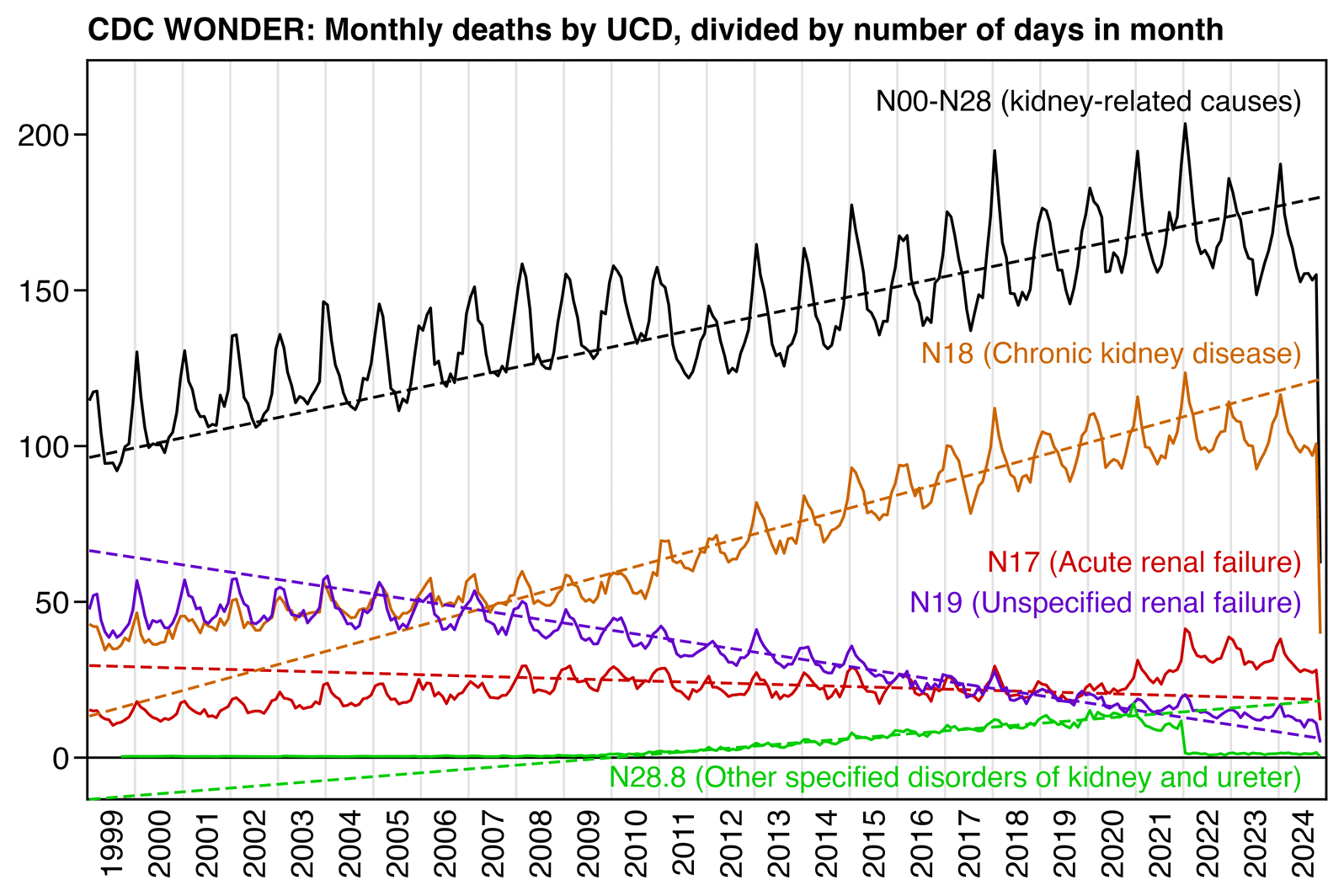 In my first plot of kidney-related deaths pre month, I only included causes of death that were included on the ICD 113 cause list under the label "Nephritis, nephrotic syndrome and nephrosis". But in the next plot where I included all ICD codes between N00 and N28, there was no longer any clear increase in deaths above the prepandemic baseline since 2020, and in fact the deaths were far below the baseline in 2023 and 2024 (even though it might be due to a change in coding practices similar to the jump down at the start of 2011):