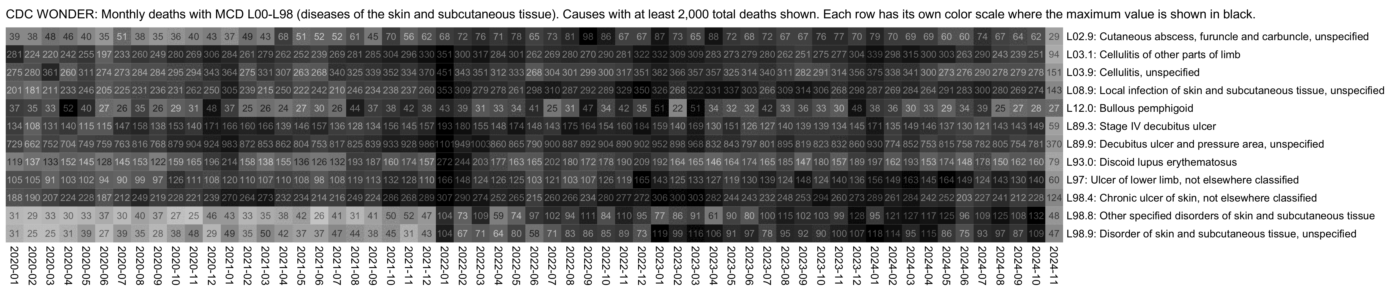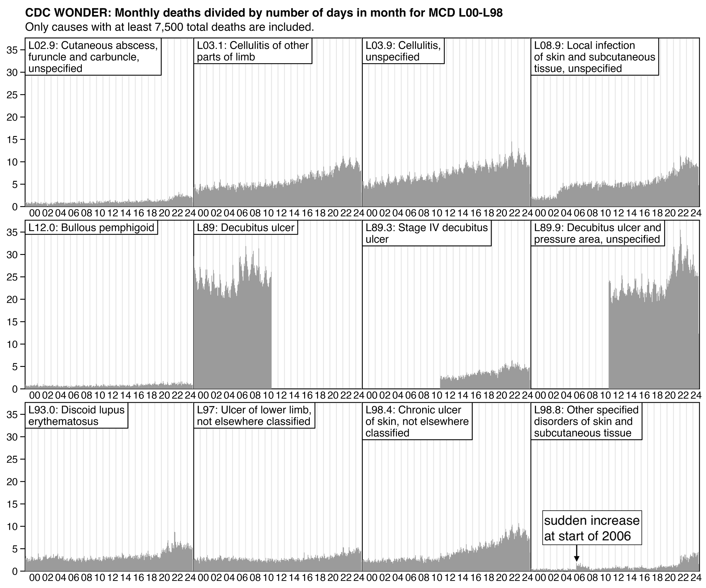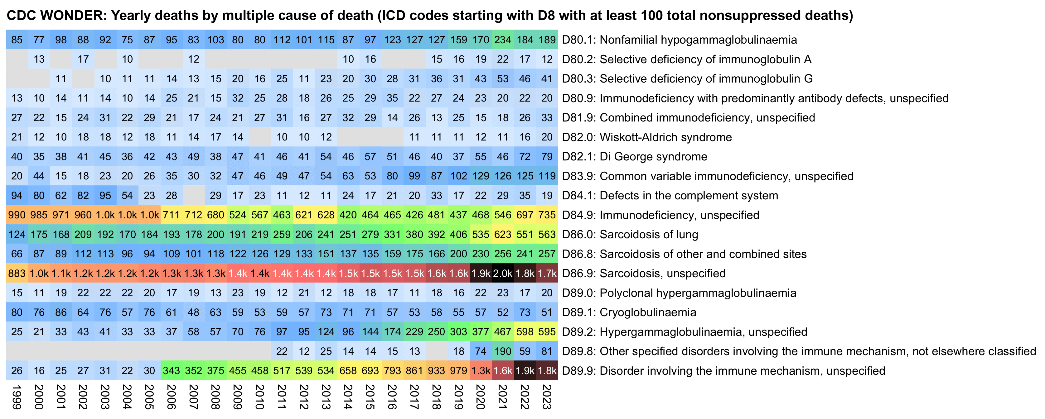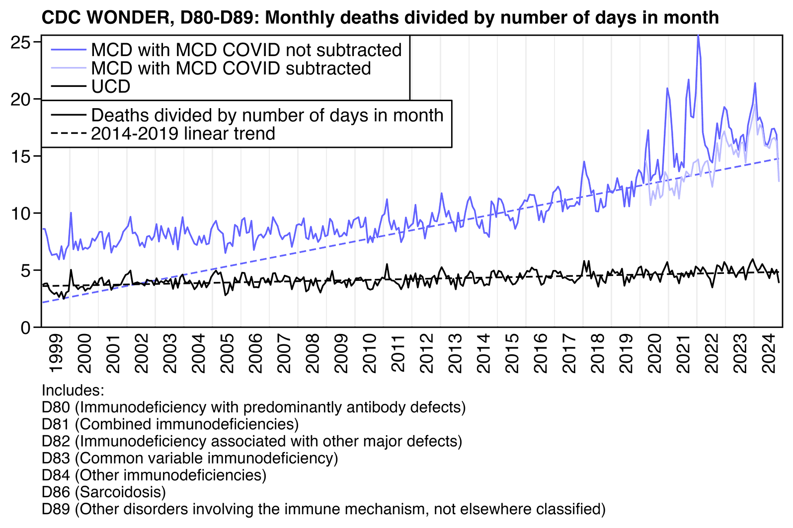 In my first plot of kidney-related deaths pre month, I only included causes of death that were included on the ICD 113 cause list under the label "Nephritis, nephrotic syndrome and nephrosis". But in the next plot where I included all ICD codes between N00 and N28, there was no longer any clear increase in deaths above the prepandemic baseline since 2020, and in fact the deaths were far below the baseline in 2023 and 2024 (even though it might be due to a change in coding practices similar to the jump down at the start of 2011):