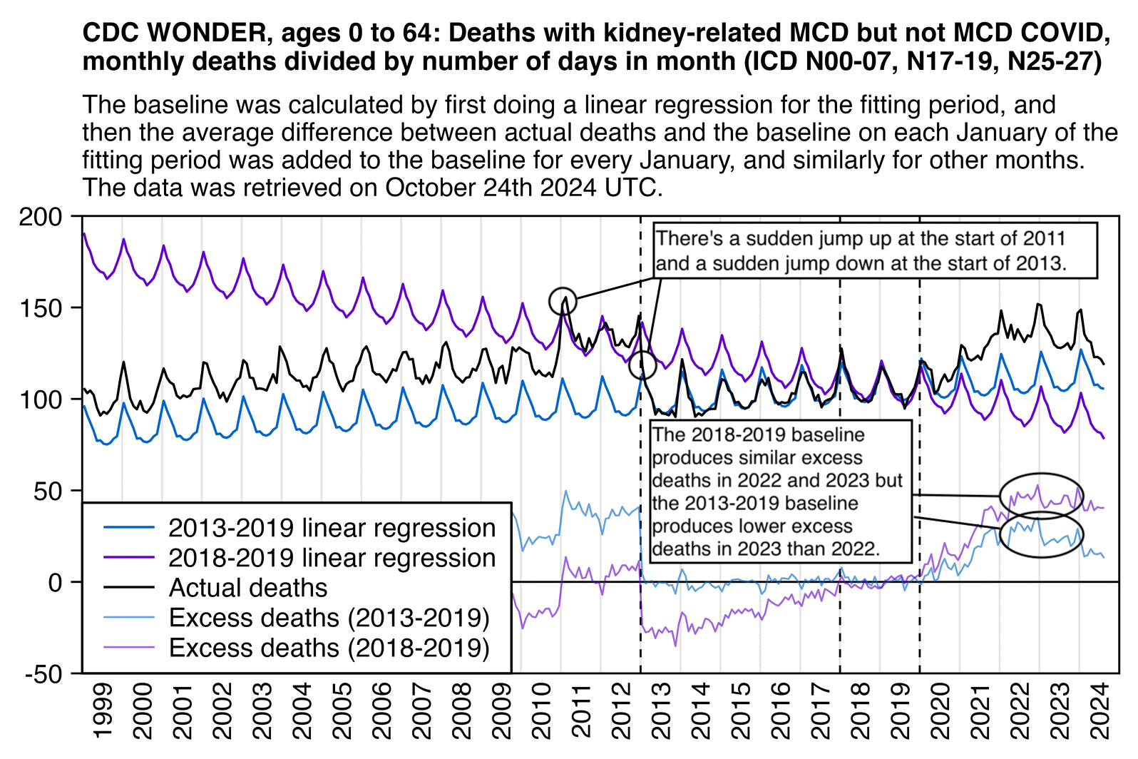 labs(title="CDC WONDER, ages 0 to 64: Deaths with kidney-related MCD but not MCD COVID,\nmonthly deaths divided by number of days in month (ICD-10 113 cause list\n\"Nephritis, nephrotic syndrome and nephrosis\"; N00-07, N17-19, N25-27)",subtitle="The baseline was calculated by first doing a linear regression for the fitting period, and then the average difference between actual deaths and the baseline on each January of the fitting period was added to the baseline for every January, and similarly for other months. The data was retrieved on October 24th 2024 UTC."|>stringr::str_wrap(93),x=NULL,y=NULL)+