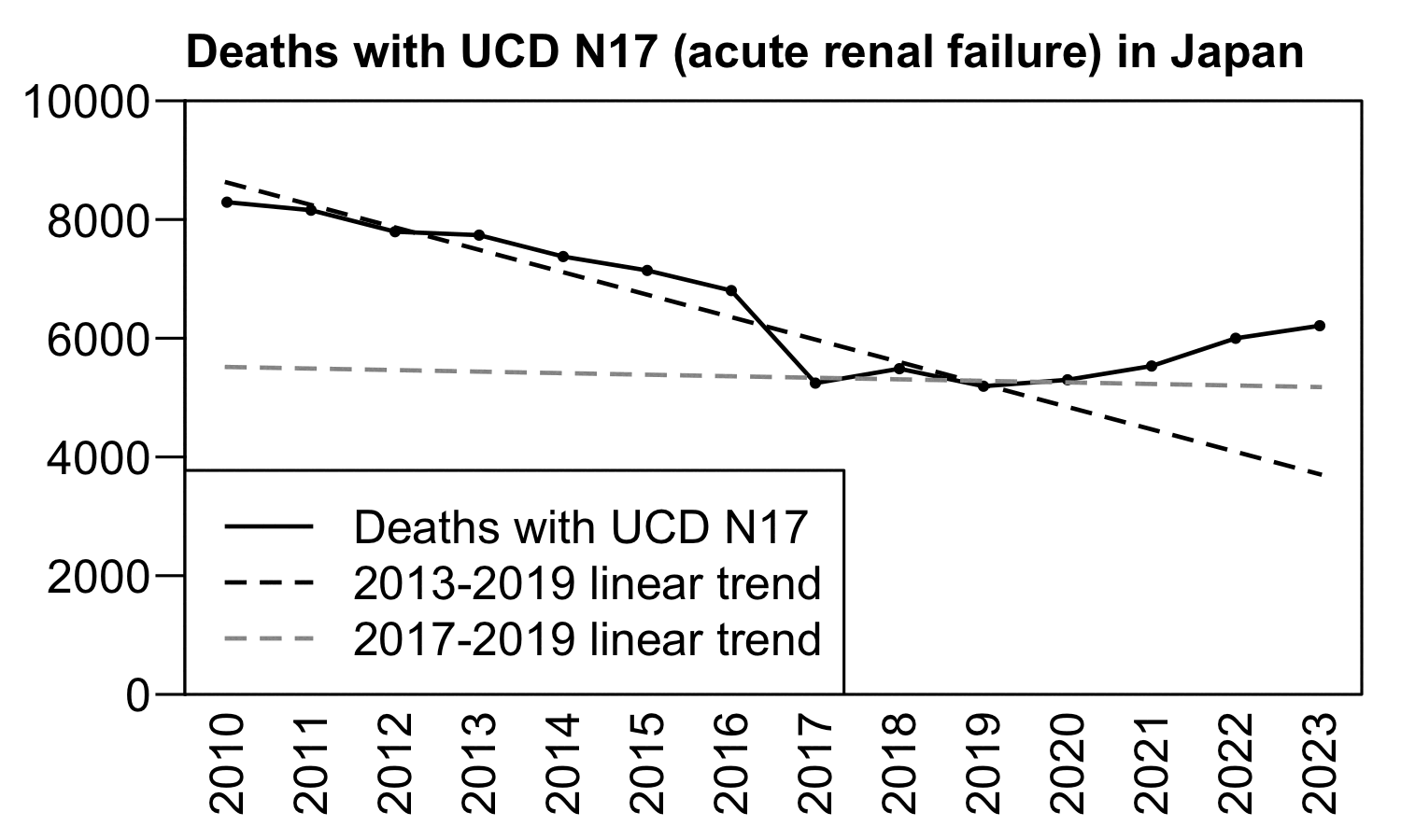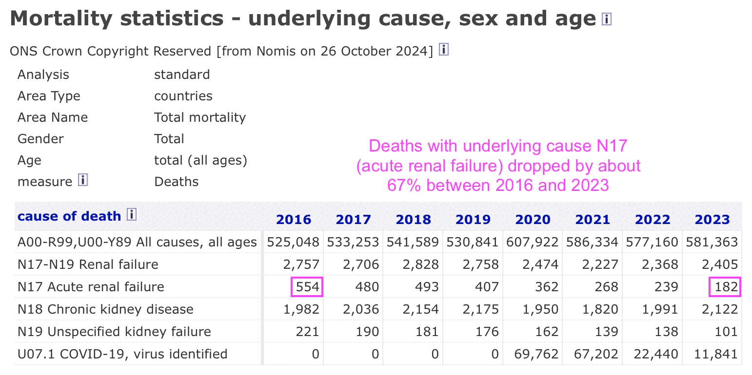 From the next table which shows deaths by UCD instead of MCD, you can see that acute renal failure isn't as common as an underlying cause of death as chronic kidney disease, and deaths with UCD chronic kidney disease were below the pre-COVID trend in 2023 and 2024. You can also see that in addition to the decrease in N28.8 (Other specified disorders of kidney and ureter), the increase in N17.9 has also been mirrored by a decrease in N19 (unspecified renal failure):