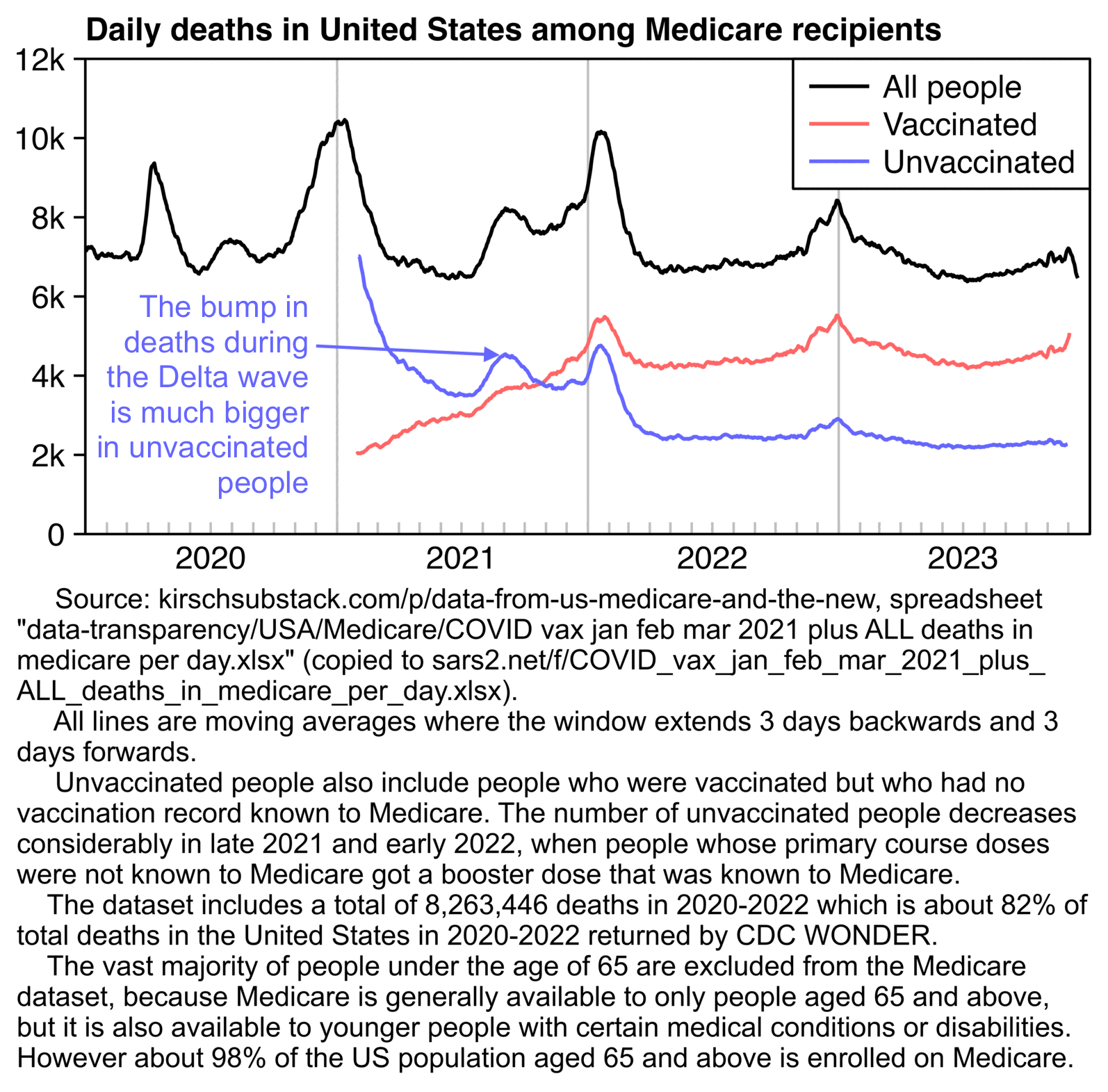 Steve Kirsch has a source at HHS who gave him data for all-cause mortality by vaccination status at Medicare. But it shows that the bump in deaths during the Delta wave was nearly flat in vaccinated people: [rootclaim3.html#Initial_analysis]