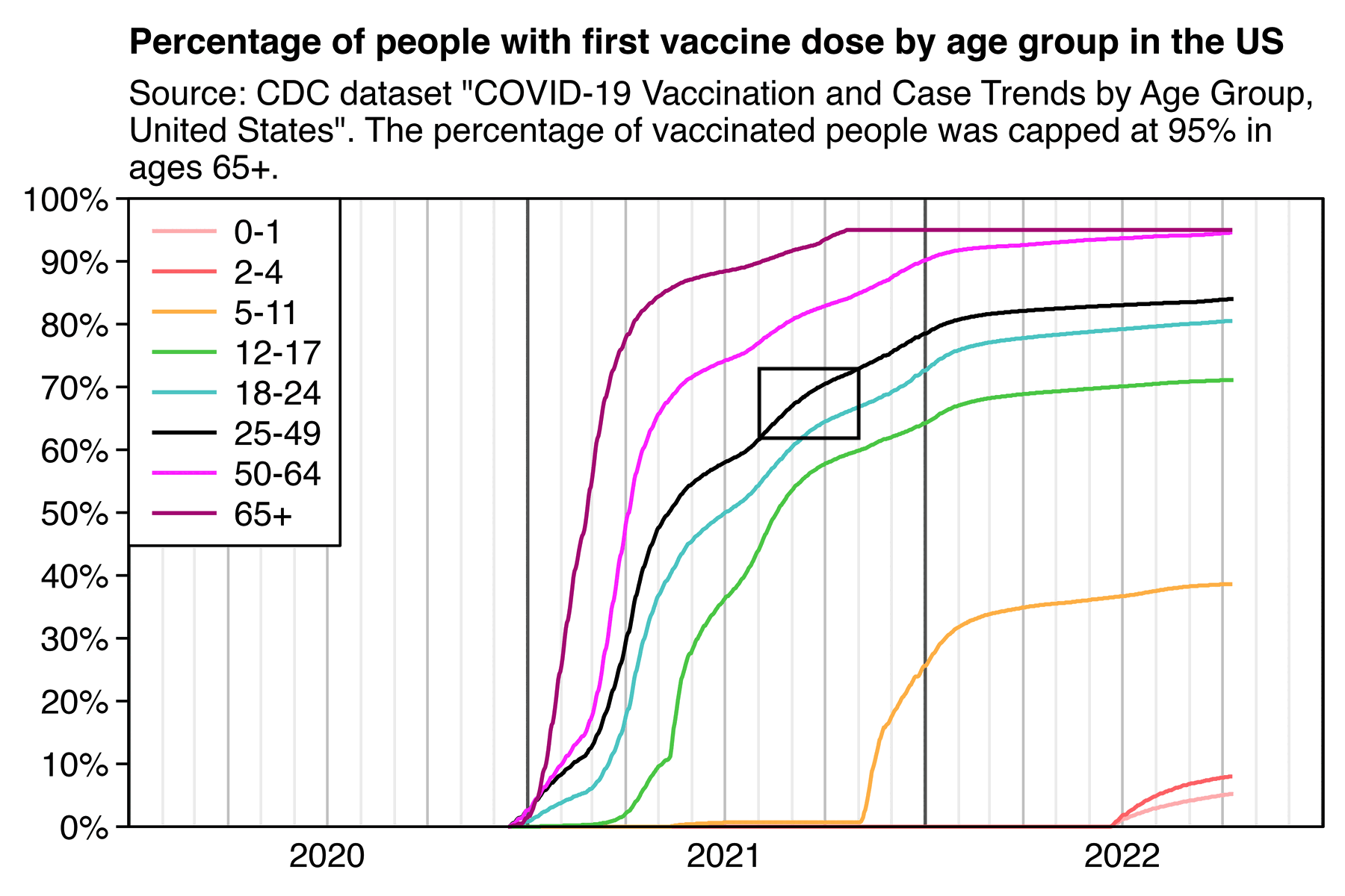 labs(title="Percentage of people with first vaccine dose by age group in the US",subtitle=paste0("Source: CDC dataset \"COVID-19 Vaccination and Case Trends by Age Group, United States\". The percentage of vaccinated people was capped at 95% in ages 65+.")|>stringr::str_wrap(73),x=NULL,y=NULL)+