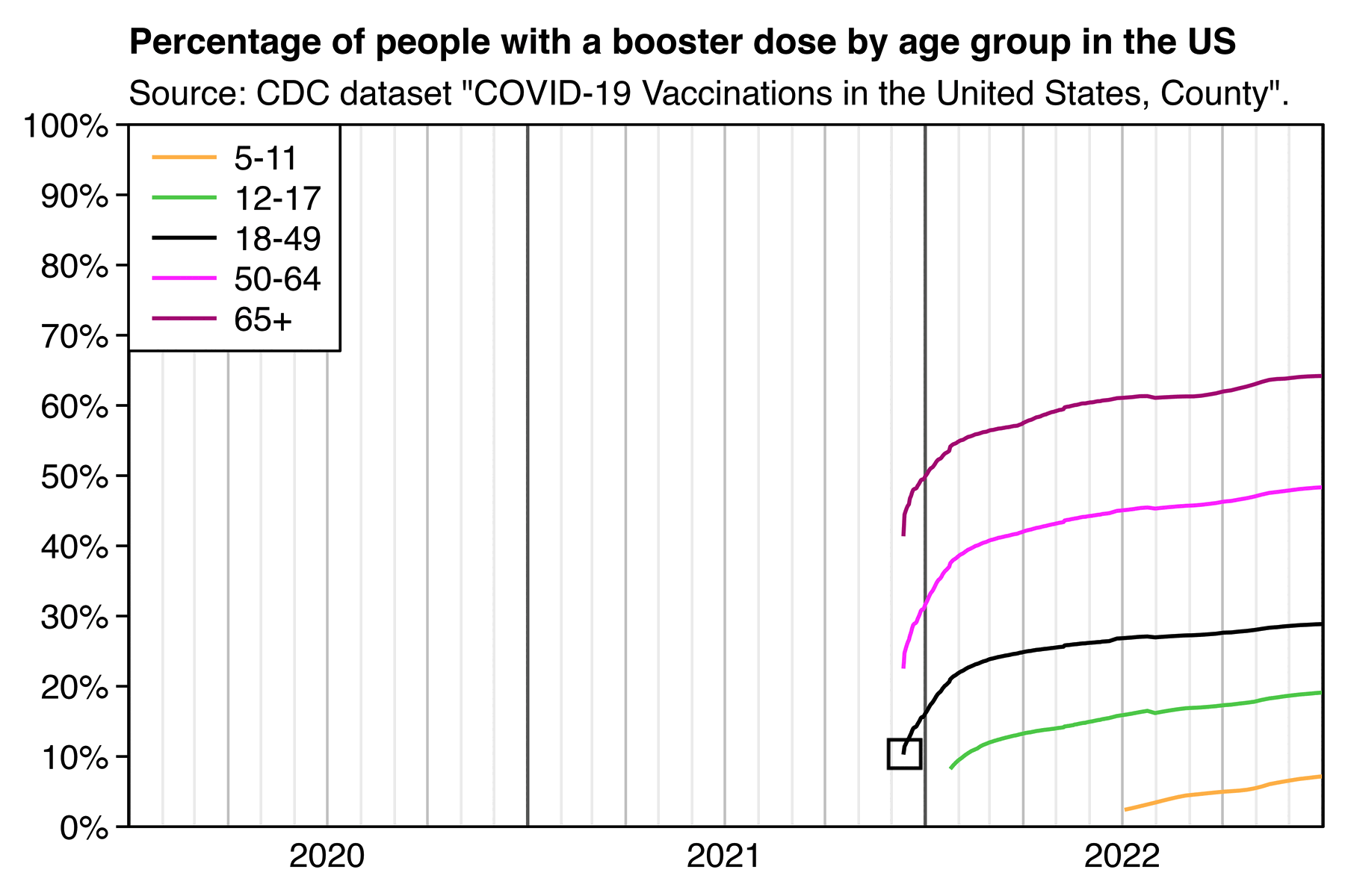 labs(title="Percentage of people with a booster dose by age group in the US",subtitle=paste0("Source: CDC dataset \"COVID-19 Vaccinations in the United States, County\".")|>stringr::str_wrap(73),x=NULL,y=NULL)+