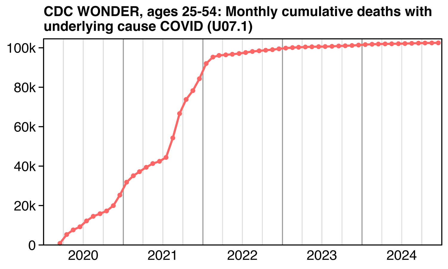 From the next plot of cumulative COVID deaths in ages 25-54, you can see that only about 25% of all COVID deaths had occurred by the end of 2020. The increase in deaths in 2023 and 2024 is not as steep as in Beaudoin's plot, but I suspect it's because Beaudoin's baseline might have been too low by 2023 and 2024: