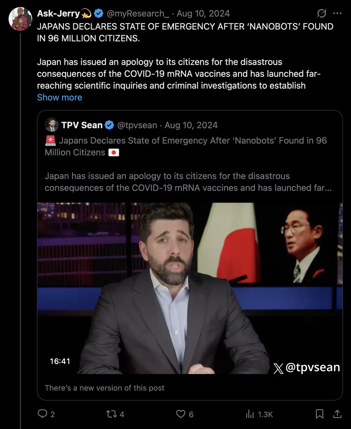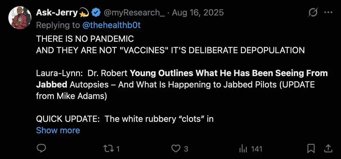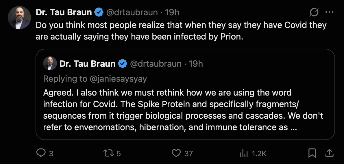 When Hirschman did his debut on the Jane Ruby Show, her show was part of the Stew Peters Network, which is notorious for promoting stories about strange objects being found in vaccines or in the blood of vaccinated people, including hydras, microchips, nanobots, graphene oxide, snake venom, hydrogel, robot arms, shards of glass, Neanderthal DNA, and gorilla feces. I call the stories "Stew ops", because the origin of the stories frequently goes back to the Stew Peters Network or to guests on the network. Stew Peters also says that the earth is flat and viruses are not real.