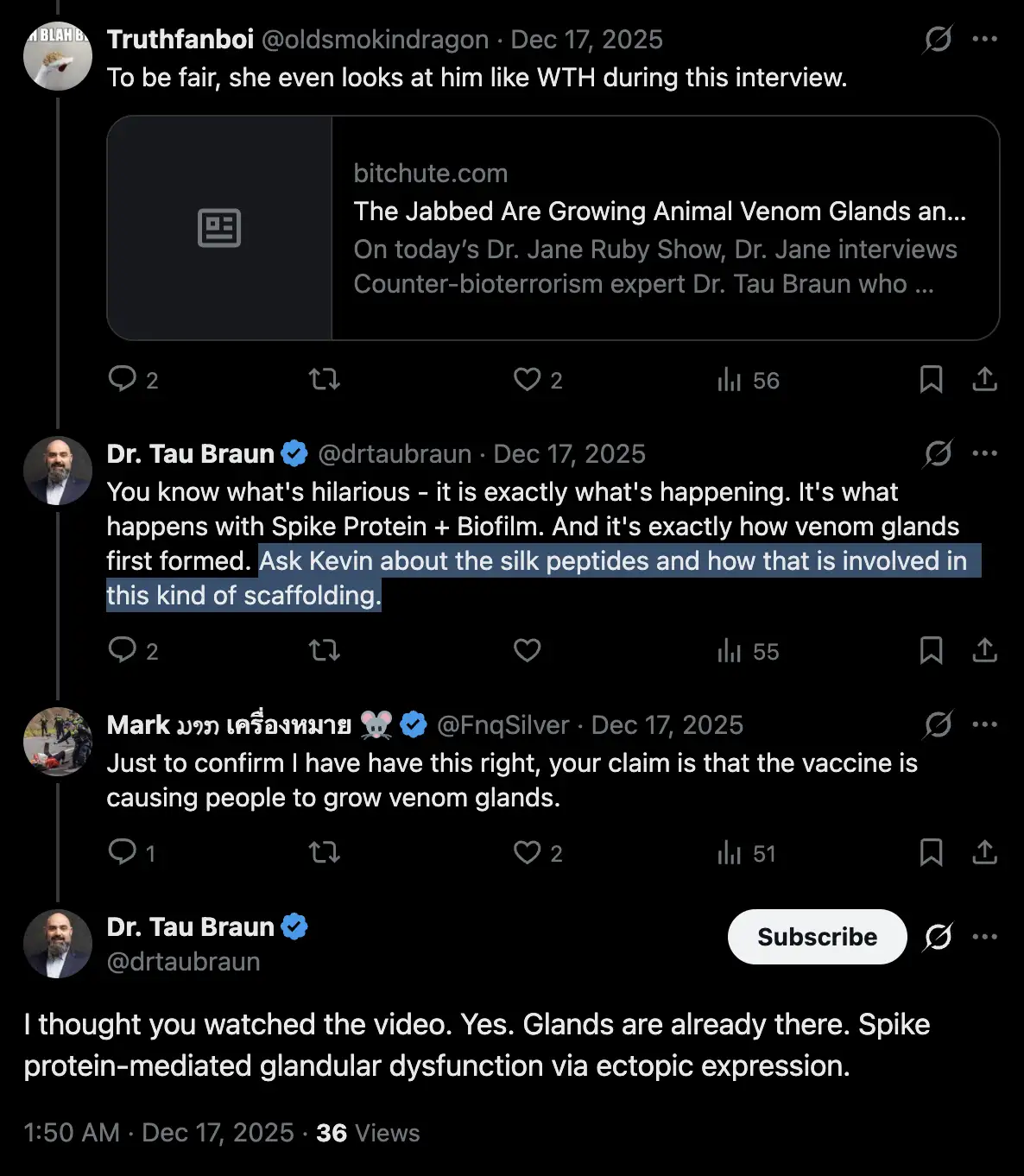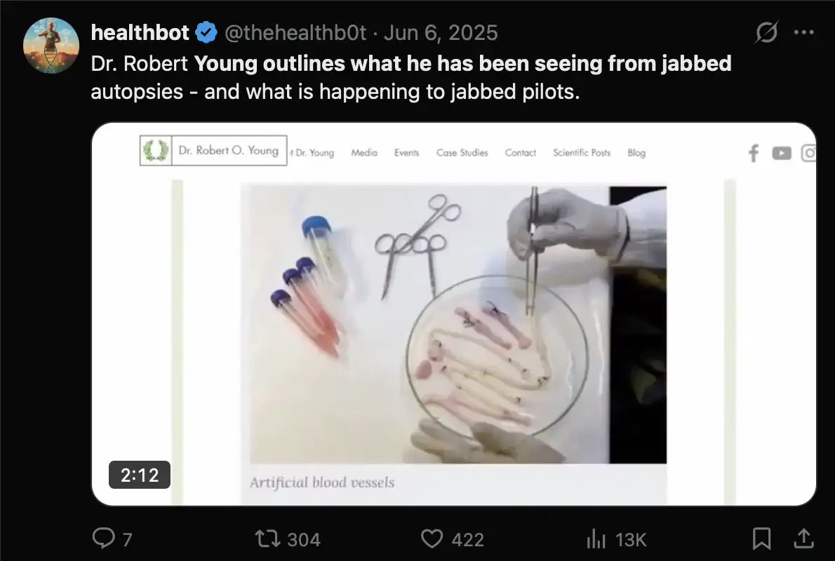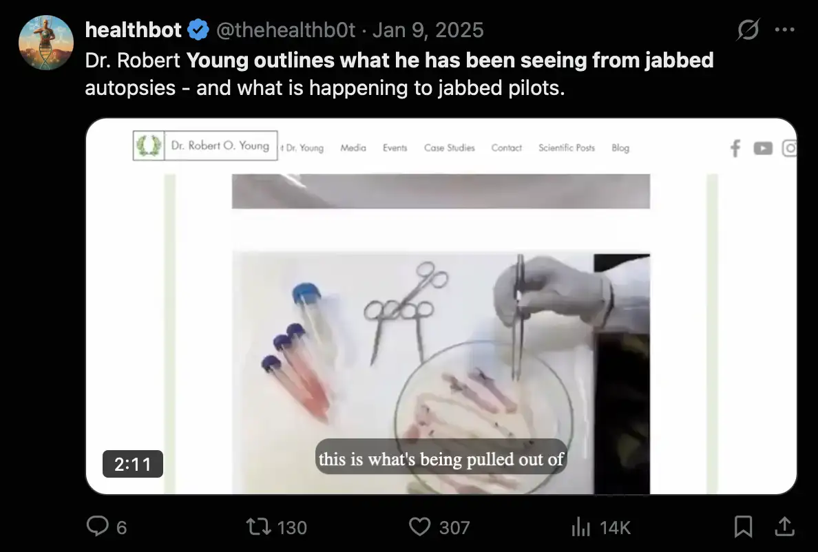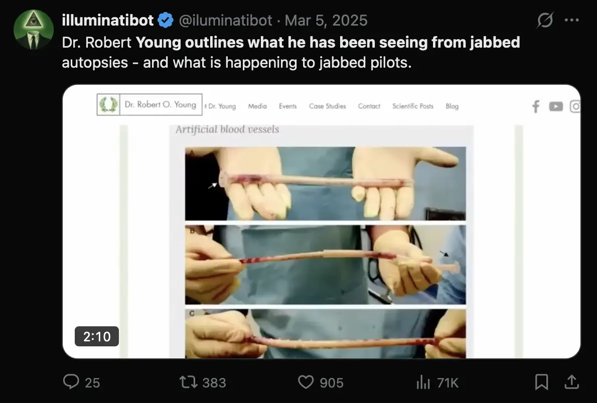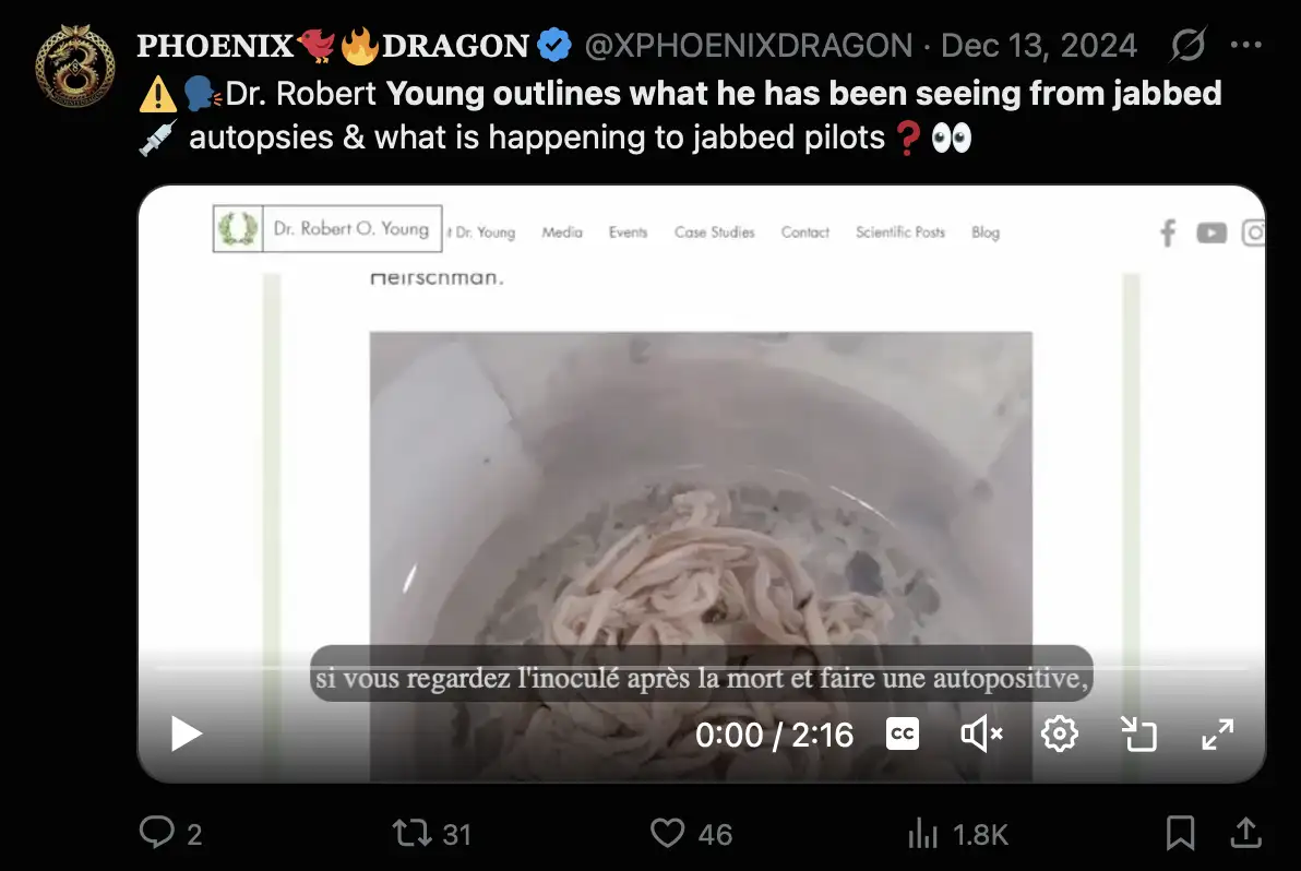 In my table above, 5 out of the last 8 people are all supposed to have seen the clots in the body of a living person, but as far as I can tell, none of the 5 people said before 2024 they had seen the clots in living people. There are only 2 people I can think of who had claimed before 2024 that they had seen the clots in the body of a living person, who are an anonymous ER doctor who was interviewed by Mike Adams on InfoWars through a voice changer, and Leunis van Rooyen who appeared on Jane Ruby's show as a member of a team of surgeons who had removed a clot from the leg of a living person. In 2023 Ryan Cole showed a photo that was later said to be a photo by Mohannad Bisharat, and Cole claimed that the photo showed a clot from a living person, but I haven't found any place where Bisharat personally claimed he had seen calamari clots before 2024.