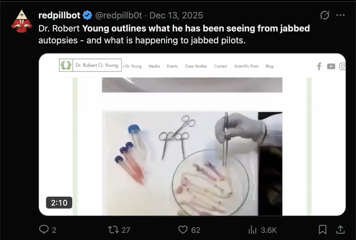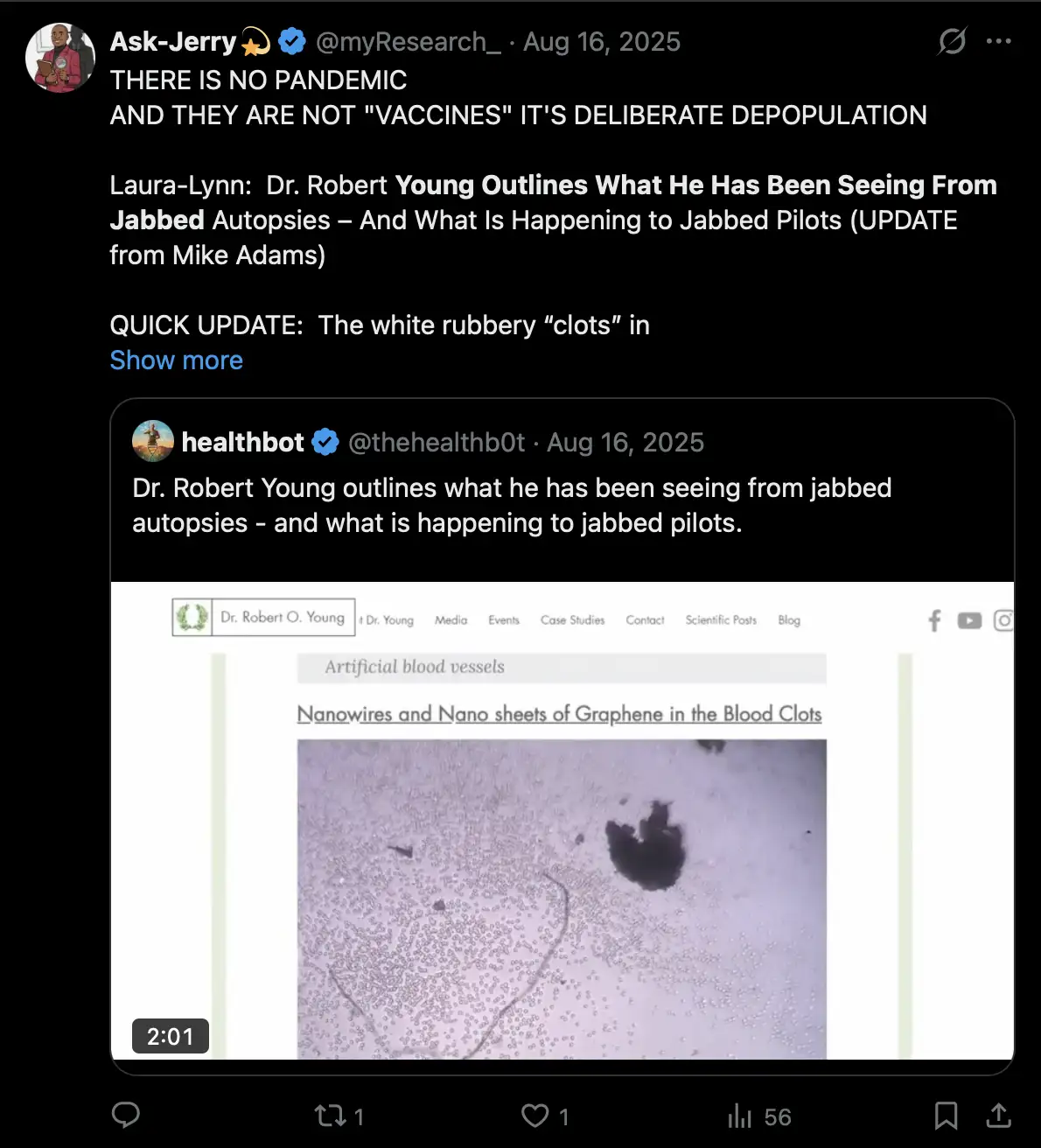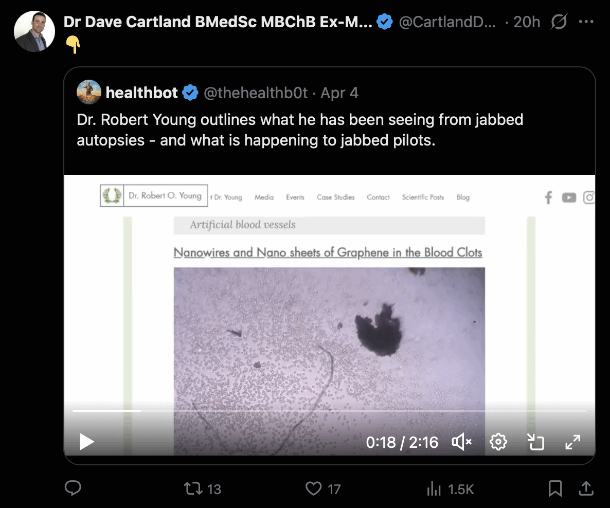 I only included people in my table who are supposed to have personally seen the clots in the body of a dead or living person, so my table is missing people who claim to have seen the clots when they analyzed the clots in a lab, who include Mike Adams, Ana Maria Mihalcea, Clifford Carnicom, Zandre Botha, Arne Burkhardt, Greg Harrison, Kevin McCairn, David Hunt, and Kevin McKernan. Ryan Cole is the only person I know who is supposed to have both analyzed the clots in a lab and to have personally seen the clots in the body of a human.