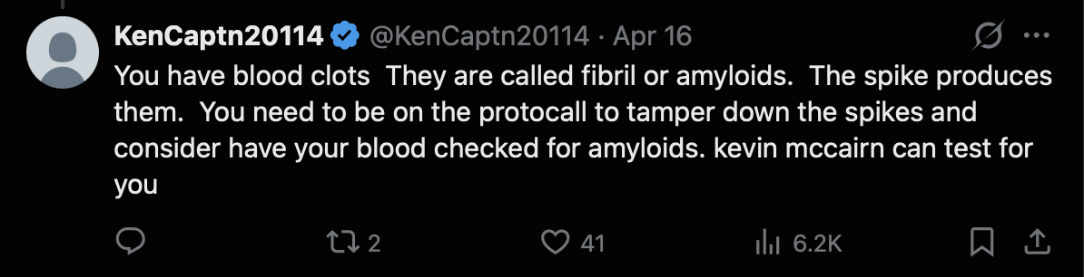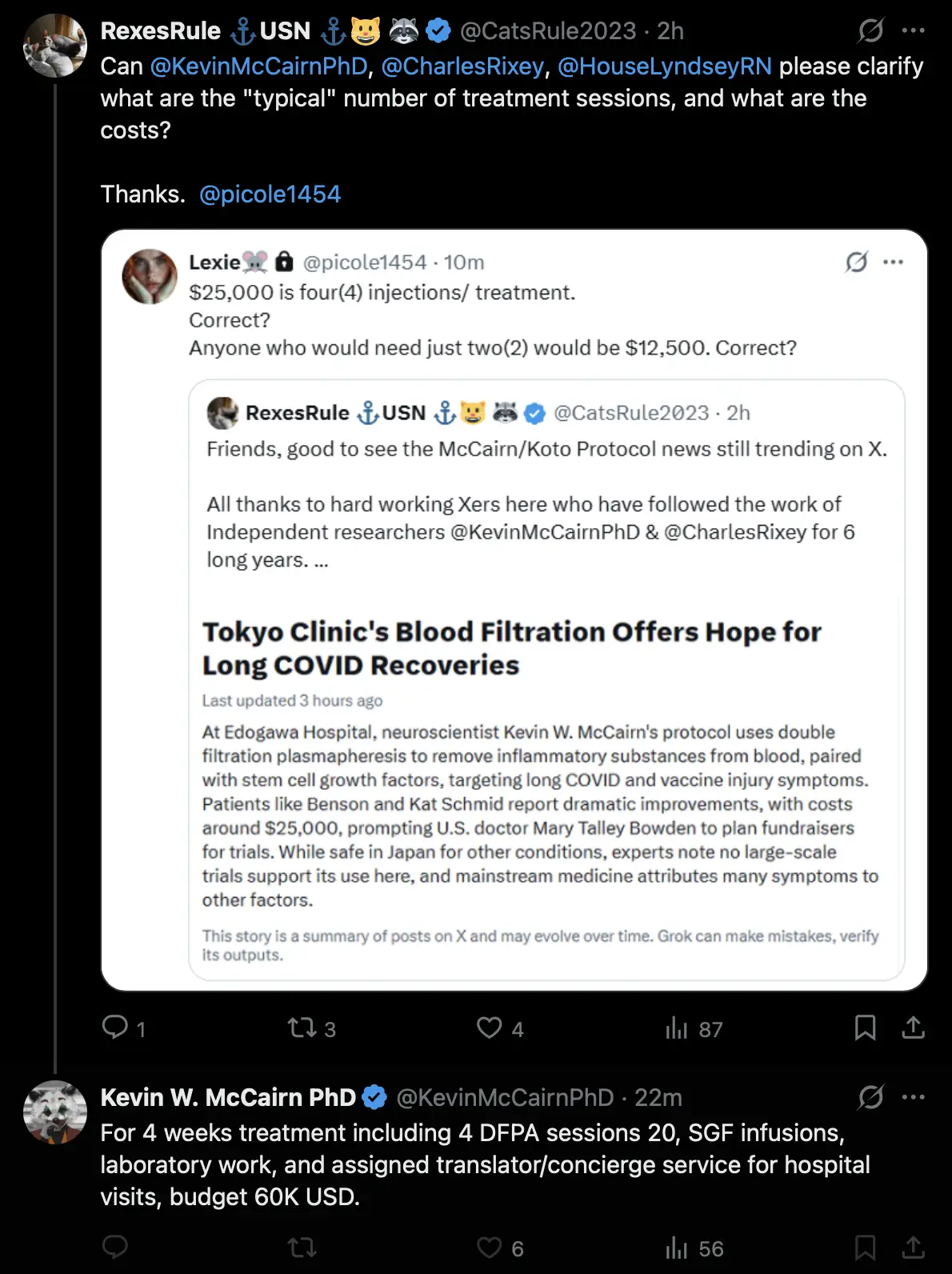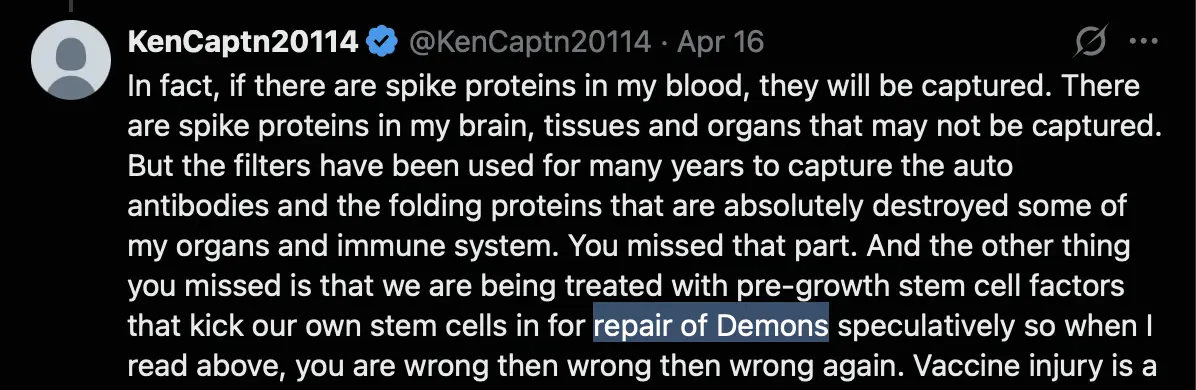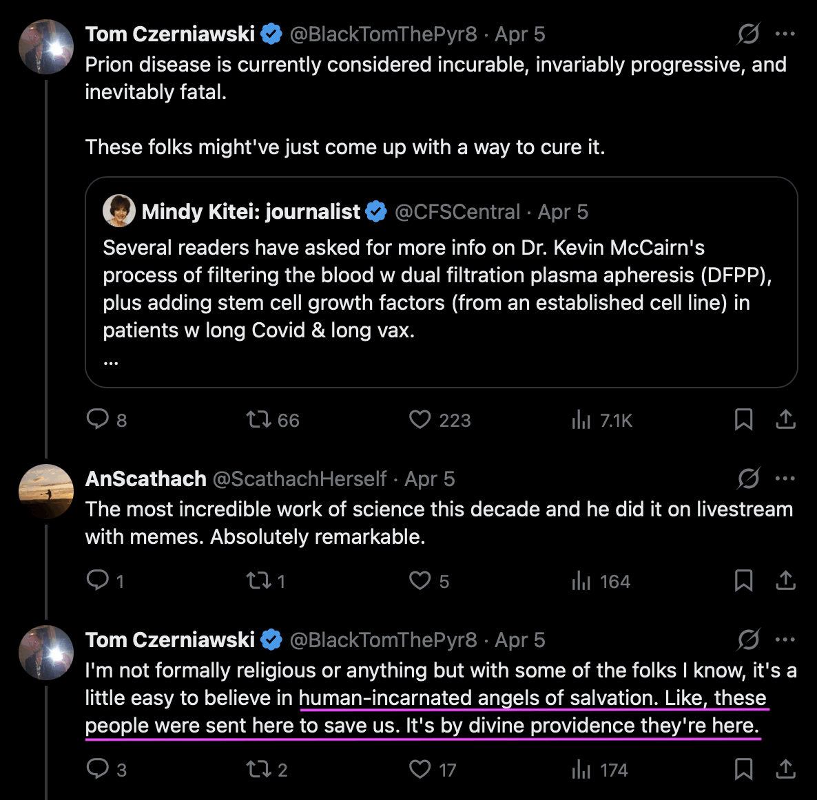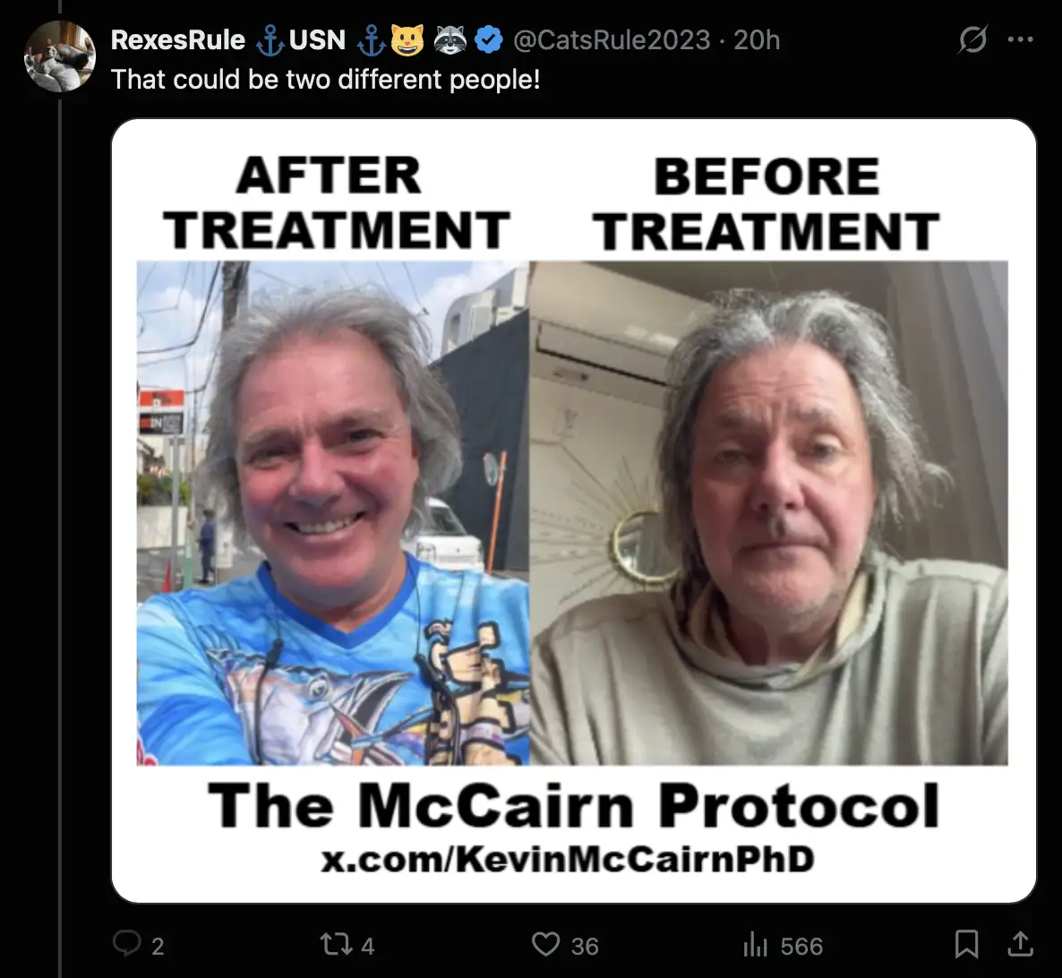 NarfGb also wrote: "And in the first line I am more pissed about the fact that he sells this protocol as a mirrage cure than to say it's pure experimental and we don't know by now what we're doing. This is the part really freaks me out." I agree with his concern, and furthermore McCairn has been fearmongering about the clots to the extent that some of his followers now believe that the clots are leading to human extinction. And one of his patients said that the clots might be the most important issue humanity is facing, and that everyone is dying from the clots, and that he would have died if he didn't get McCairn's treatment. He also speculated that the stem cell growth factors "repair demons", which makes it seem like he didn't understand the purpose of the treatment well enough to have informed consent.