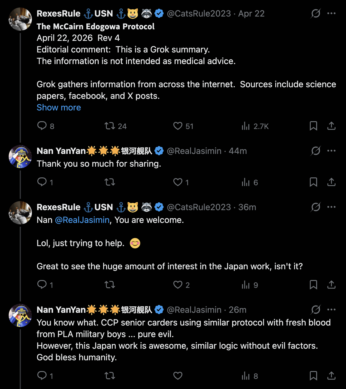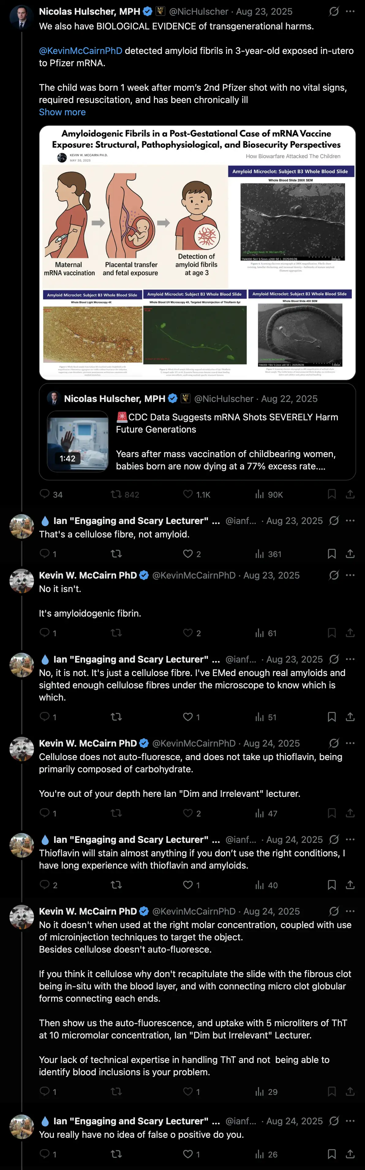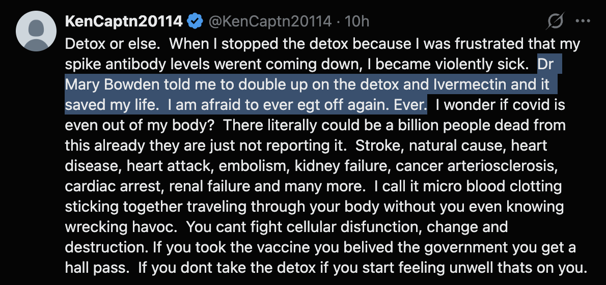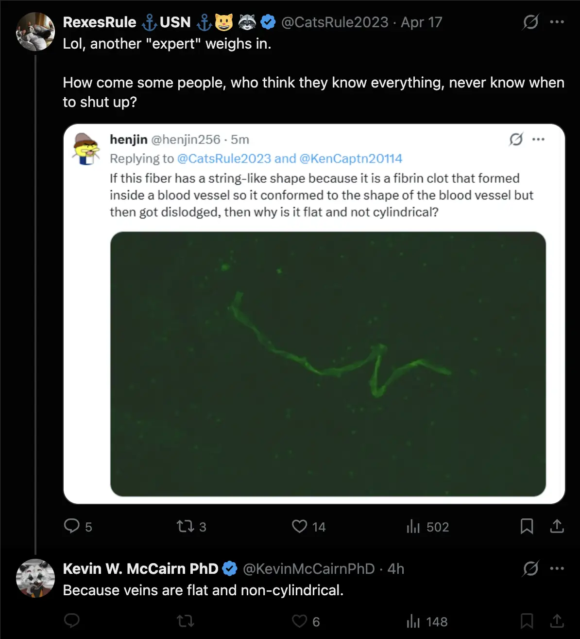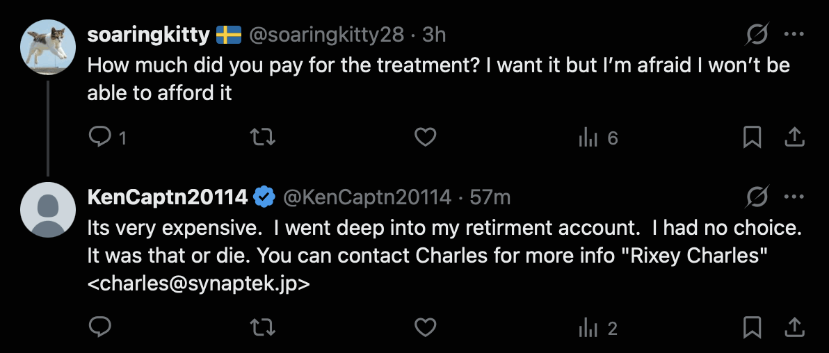 NarfGb also wrote: "And in the first line I am more pissed about the fact that he sells this protocol as a mirrage cure than to say it's pure experimental and we don't know by now what we're doing. This is the part really freaks me out." I agree with his concern, and furthermore McCairn has been fearmongering about the clots to the extent that some of his followers now believe that the clots are leading to human extinction. And one of his patients said that the clots might be the most important issue humanity is facing, and that everyone is dying from the clots, and that he would have died if he didn't get McCairn's treatment. He also speculated that the stem cell growth factors "repair demons", which makes it seem like he didn't understand the purpose of the treatment well enough to have informed consent.