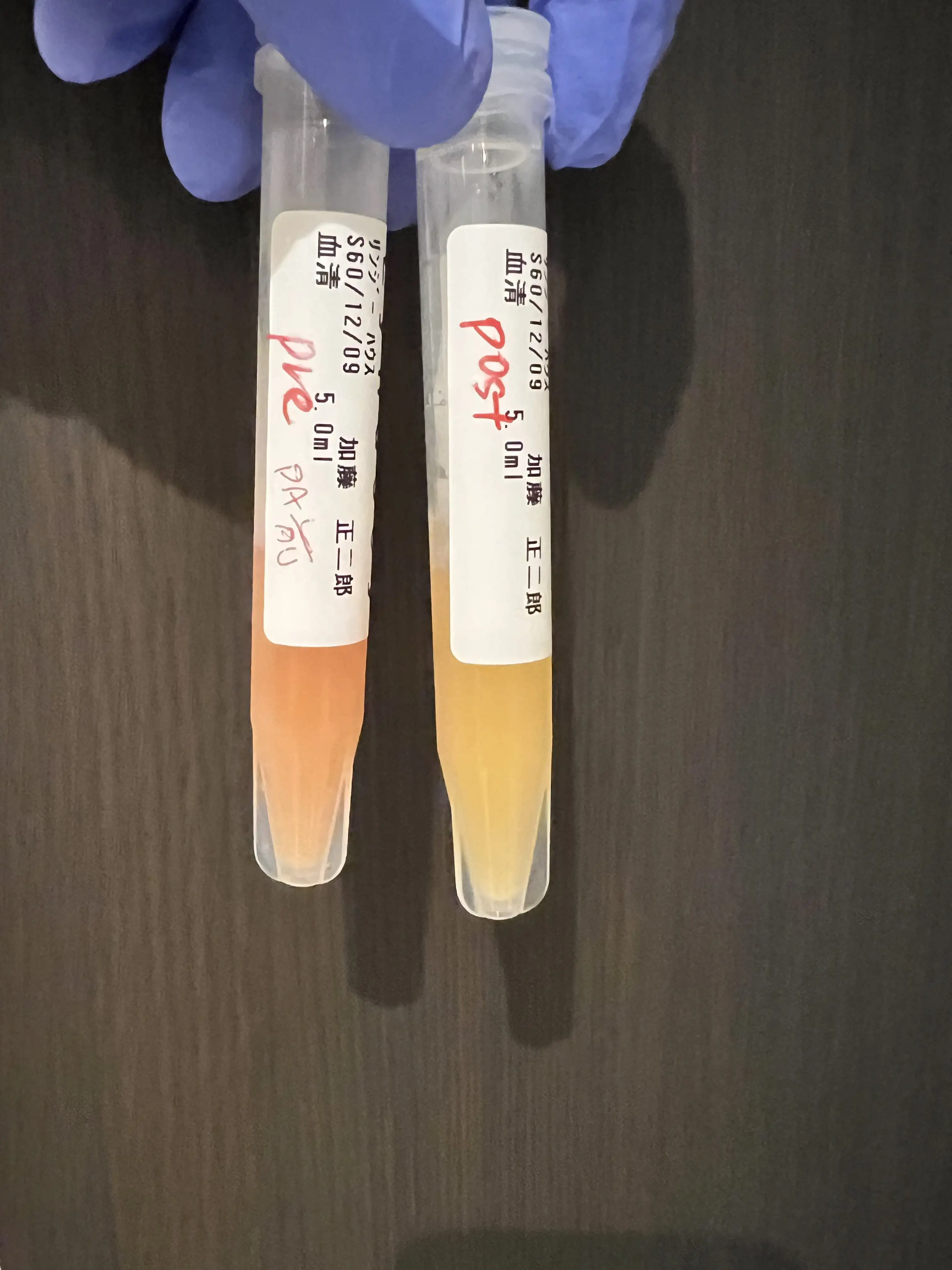 Overall, the pre-DFPP plasma appears more red or orange primarily because it contains higher levels of lipoproteins and proteins, with possible minor contributions from hemolysis or concentration effects. The post-DFPP plasma looks clearer and more yellow because those larger, color-influencing components have been reduced.