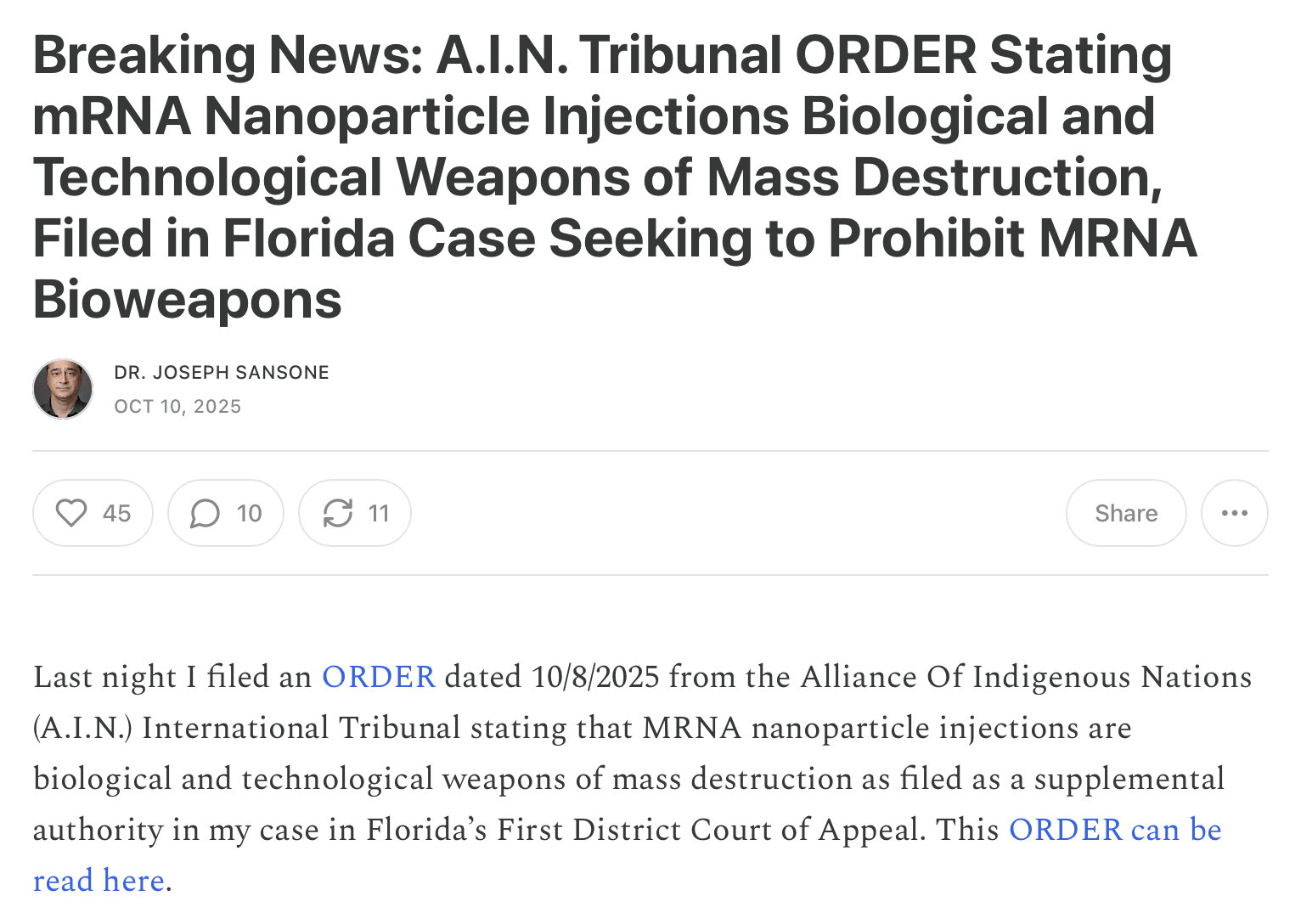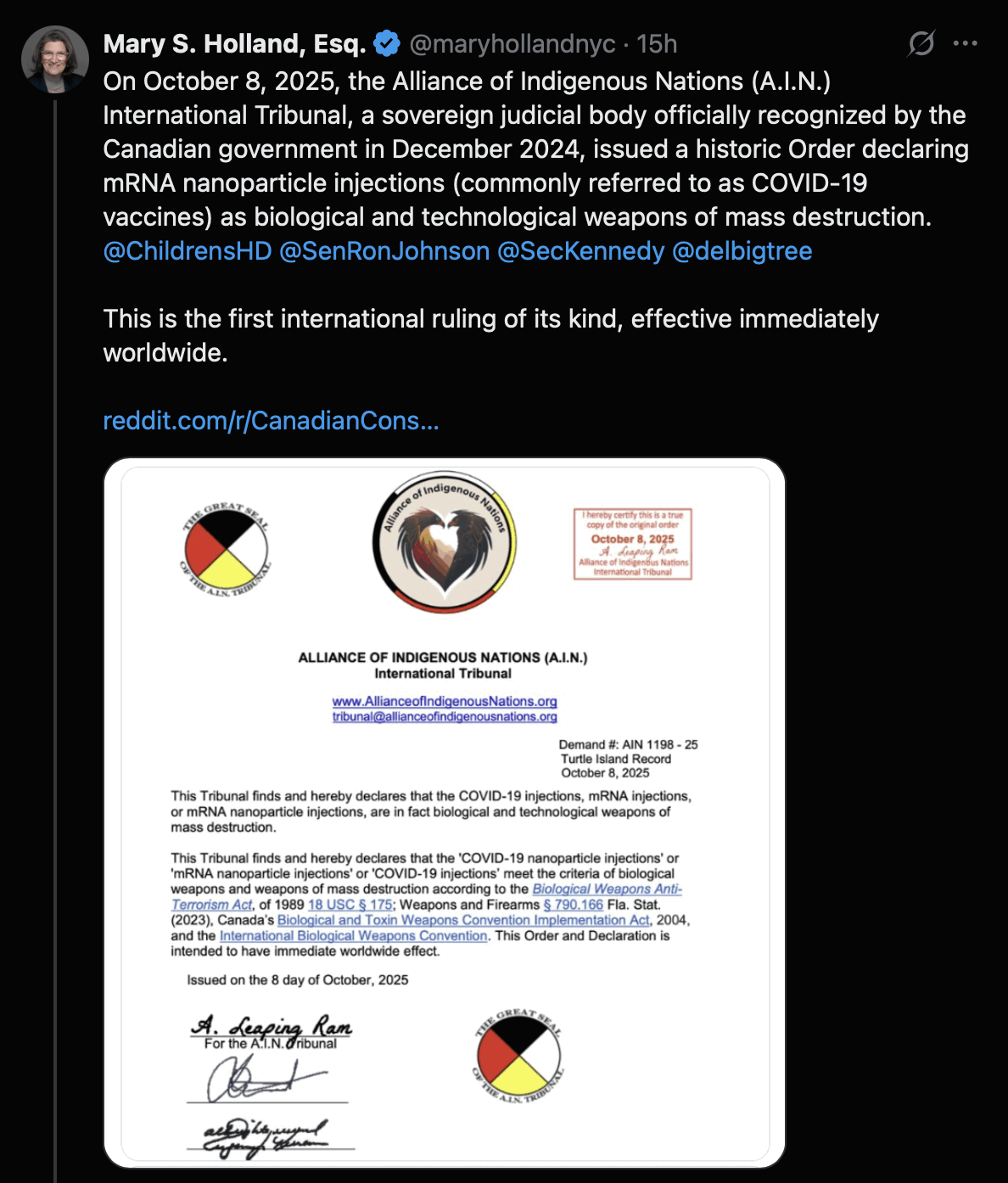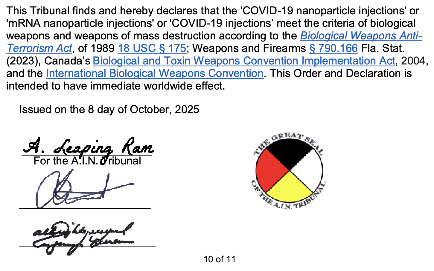 In October 2025 Joe Sansone broke the news that the "Alliance of Indigenous Nations International Tribunal" declared that the COVID-19 vaccines "meet the criteria of biological weapons and weapons of mass destruction": [https://www.josephsansone.com/p/breaking-news-ain-tribunal-order]