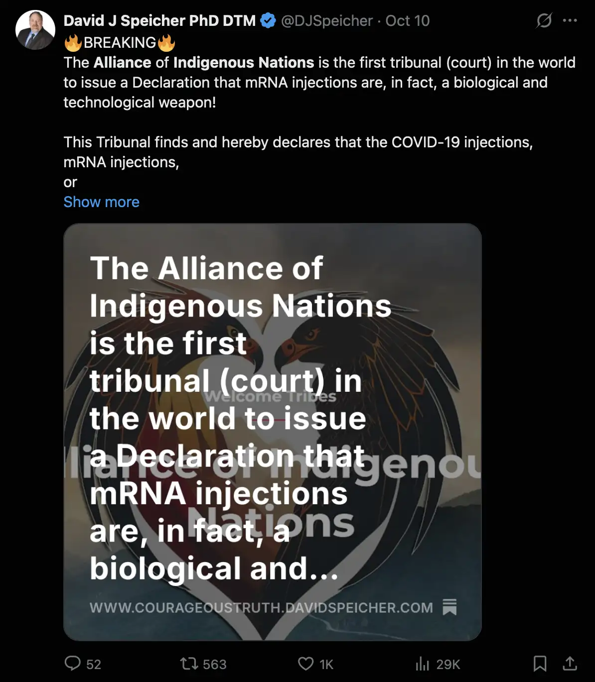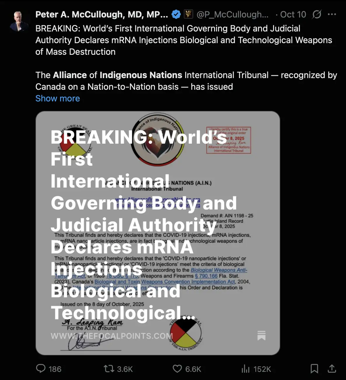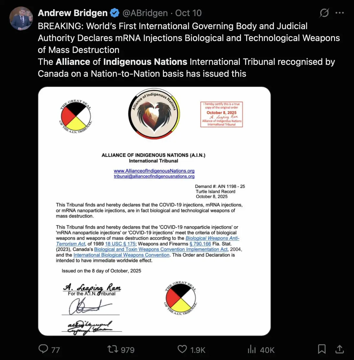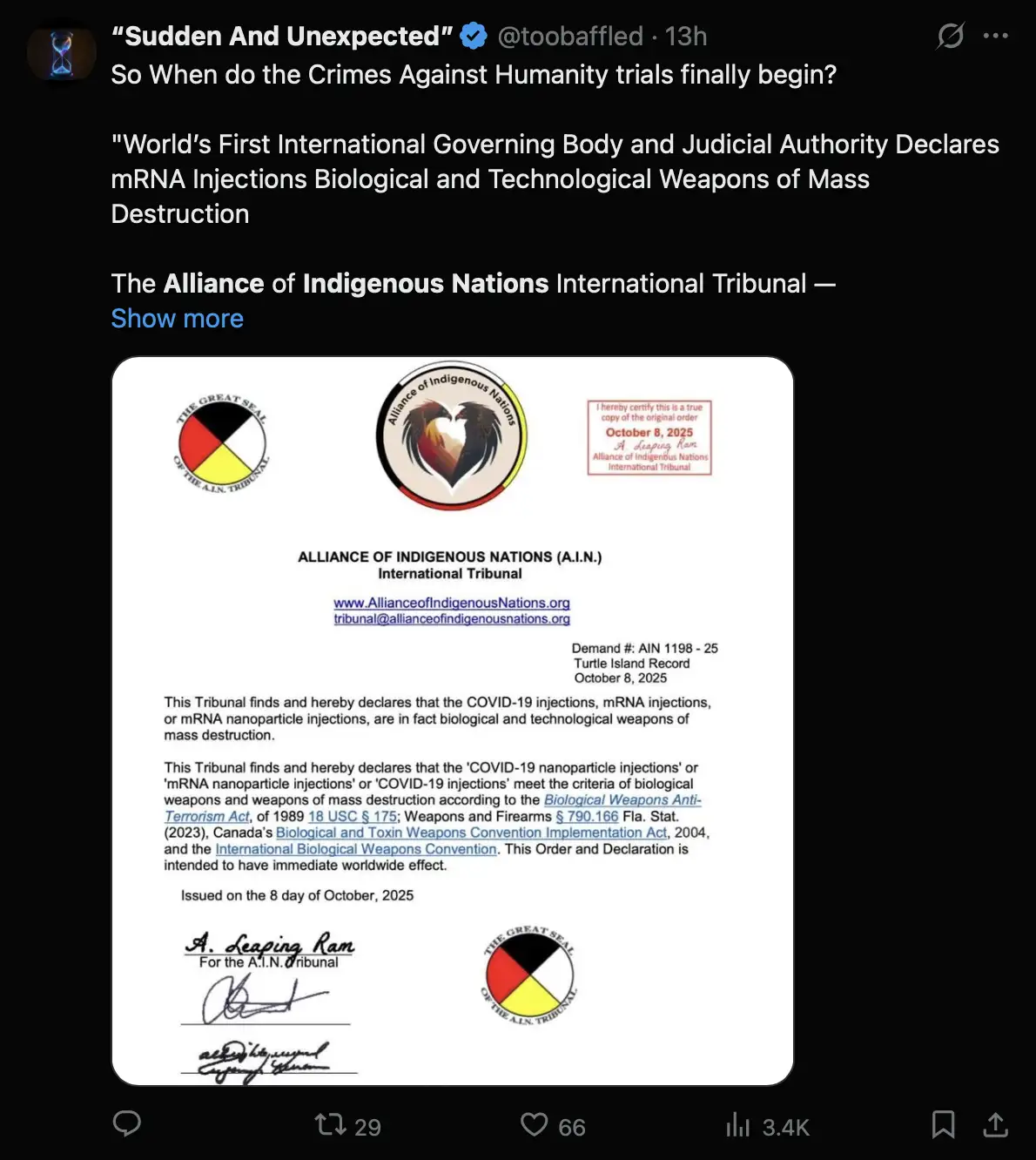 In October 2025 Joe Sansone broke the news that the "Alliance of Indigenous Nations International Tribunal" declared that the COVID-19 vaccines "meet the criteria of biological weapons and weapons of mass destruction": [https://www.josephsansone.com/p/breaking-news-ain-tribunal-order]