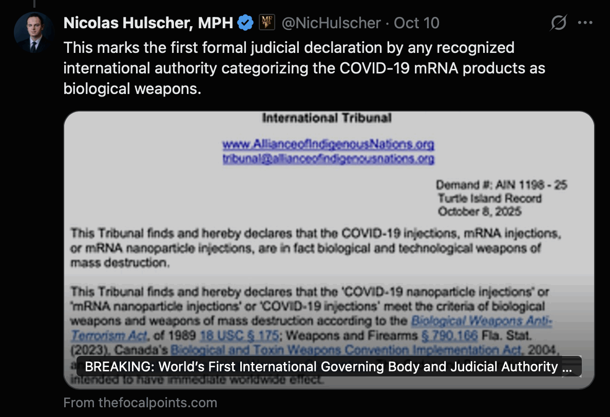 Nicolas Hulscher said that AIN's declaration "marks the first formal judicial declaration by any recognized international authority categorizing the COVID-19 mRNA products as biological weapons": [https://x.com/NicHulscher/status/1976435606139118023]