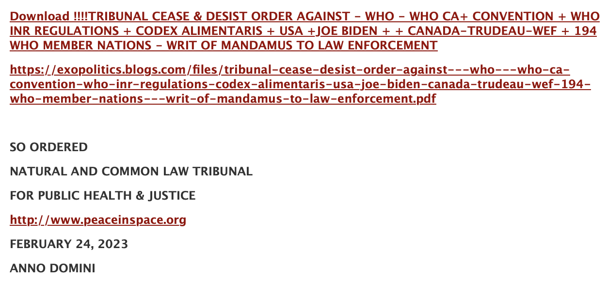 In 2023 Alfred Lambremont Webre's tribunal issued an "EMERGENCY INJUNCTION AND TRIBUNAL ORDER TO IMMEDIATELY CEASE & DESIST A CRIMINAL CONSPIRACY TO COMMIT WAR CRIMES, GENOCIDE & CRIMES AGAINST HUMANITY", where the defendants included the WHO, Joe Biden, Anthony Fauci, Klaus Schwab, and Theresa Tam: [https://web.archive.org/web/20230227035656/https://exopolitics.blogs.com/international_criminal_co/2023/02/natural-and-common-law-tribunal-for-public-health-and-justice-wwwpeaceinspaceorg-to-a-2009-2023-lockstep-ongoing-c.html]