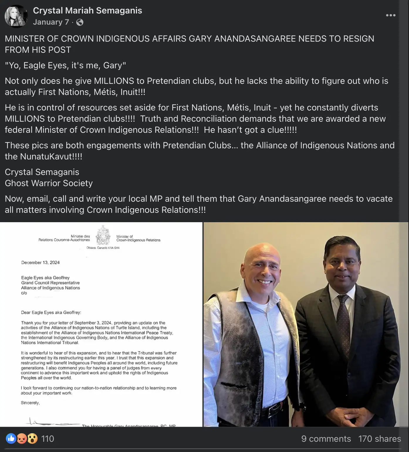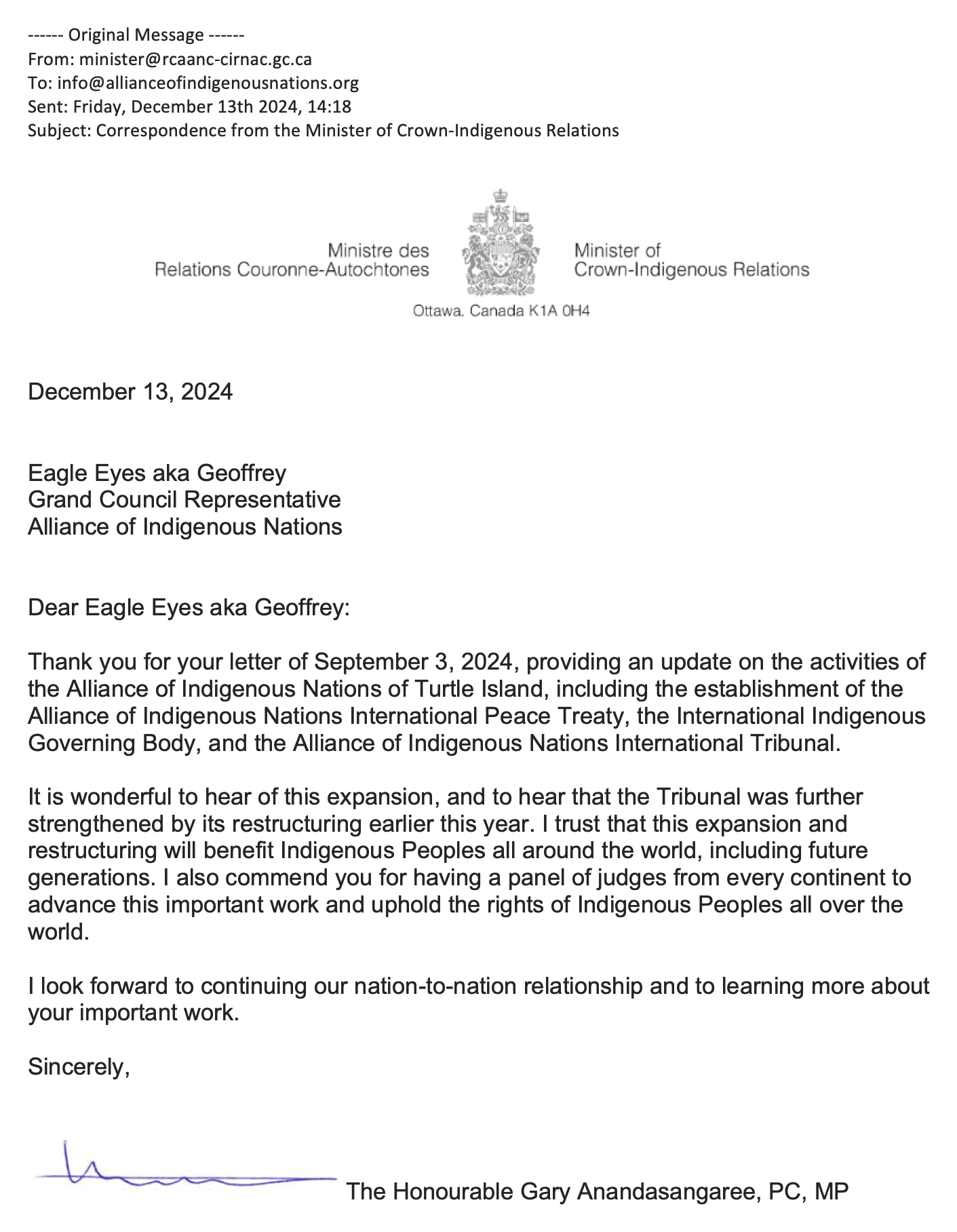 AIN claims that they were "officially recognized" by CIRNAC (Crown-Indigenous Relations and Northern Affairs Canada). AIN's website says: "In a letter from CIRNAC dated Dec. 13, 2024, the U.N. member Nation CANADA officially recognized the Alliance of Indigenous Nations, along with its Treaty and its International Tribunal presided over by Judges from all over the world. CANADA also stated that the relationship between CANADA and the A.I.N. is Nation to Nation." [https://allianceofindigenousnations.org]