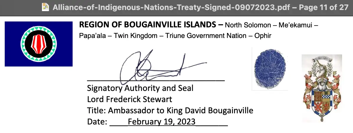 I now identified the second person whose signature was included in AIN's vaccine declaration. He is Lord Frederick Stewart, who is an ambassador to a Papuan conman called King David: [https://allianceofindigenousnations.org/wp-content/uploads/2023/09/Alliance-of-Indigenous-Nations-Treaty-Signed-09072023.pdf]