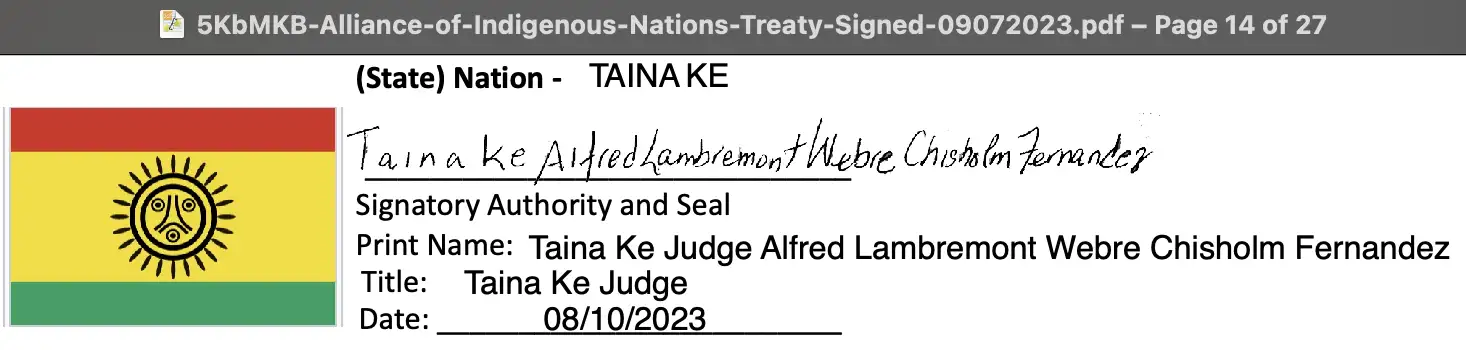 One of the nations that signed the AIN treaty is the "Taina Ke" nation, whose representative was Alfred Lambremont Webre: [https://allianceofindigenousnations.org/wp-content/uploads/2023/09/Alliance-of-Indigenous-Nations-Treaty-Signed-09072023.pdf]
