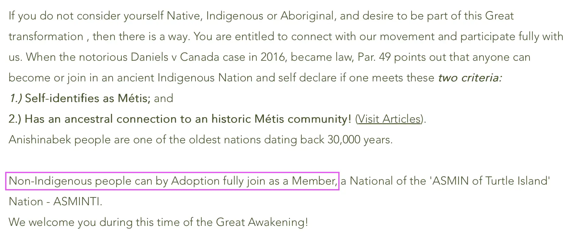 [19] The evidence before me indicates that Chief Wabiska's email address, which includes the phrase "askit4equity," is linked to a website advertising the Anishinabek Solutrean Metis Indigenous Nation ("ASMIN"), which claims to be one of the oldest unsurrendered, untreatied matriarchal Indigenous Nations of Turtle Island. For $225, anyone can become a member of the ASMIN nation on filling out an application.