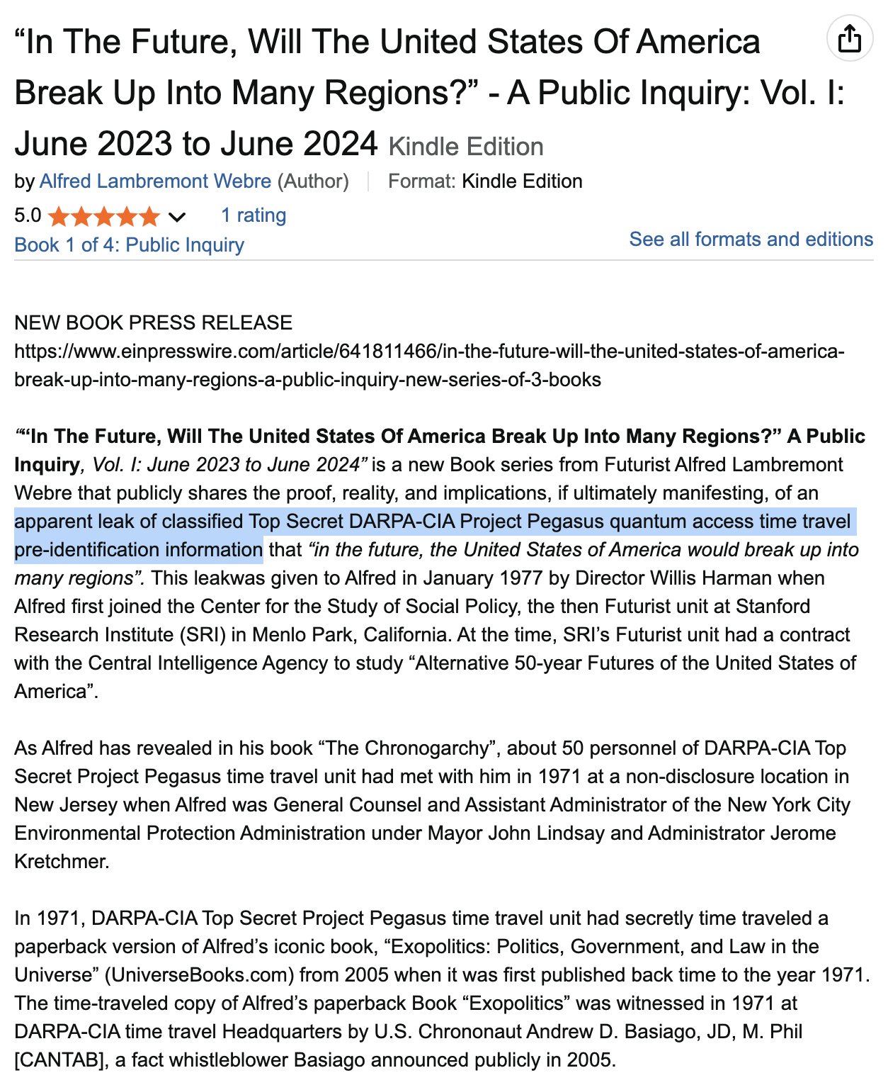 Alfred Lambremont Webre says that the book he wrote with A Leaping Ram is based on information leaked from a DARPA-CIA time travel program: [https://www.amazon.com/Future-United-States-America-Regions-ebook/dp/B0C87CRKTL]