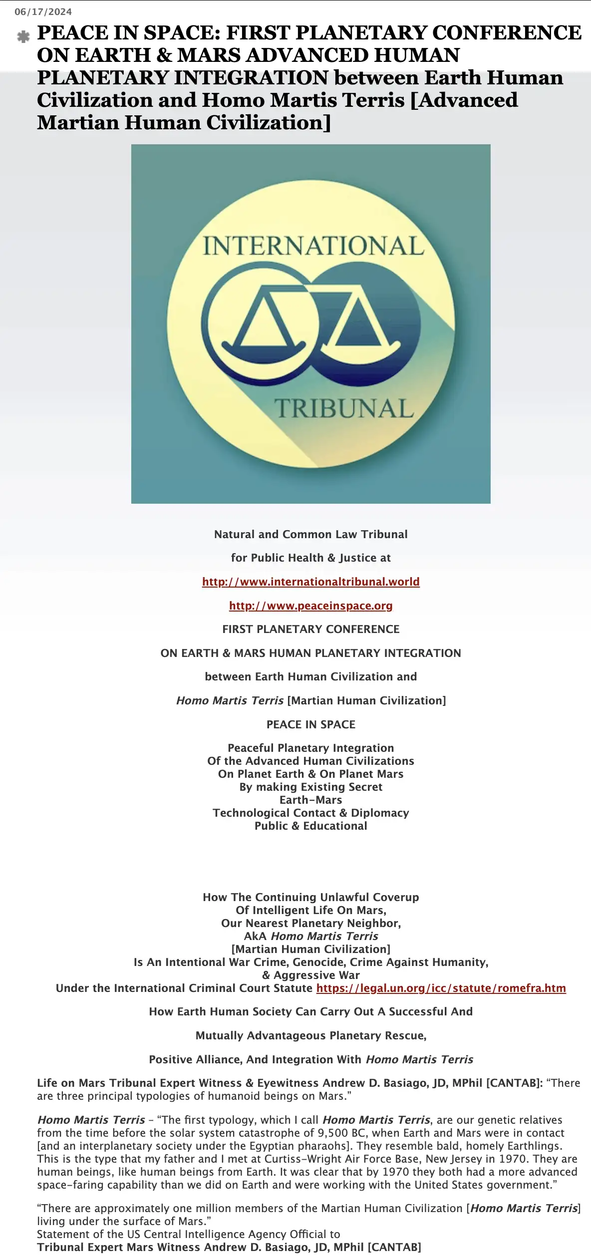 The conference was part of Webre's "Natural and Common Law Tribunal for Public Health & Justice". Webre's source that there are about one million members of the race Homo Martis Terris was Andrew Basiago, who is supposed to have met one of the Martians when he traveled back in time to 1970: [https://web.archive.org/web/20250207012549/https://exopolitics.blogs.com/international_criminal_co/2024/06/first-international-earth-conference-on-extraterrestrial-genocide-.html]
