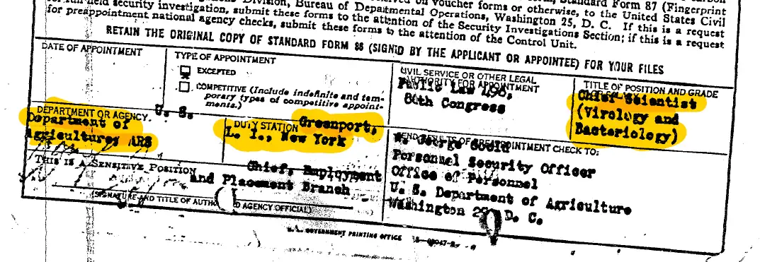 weaponize over 40 pathogens and is place in the position of 'Supervisory Bacteriologist' for the U.S. Navy and