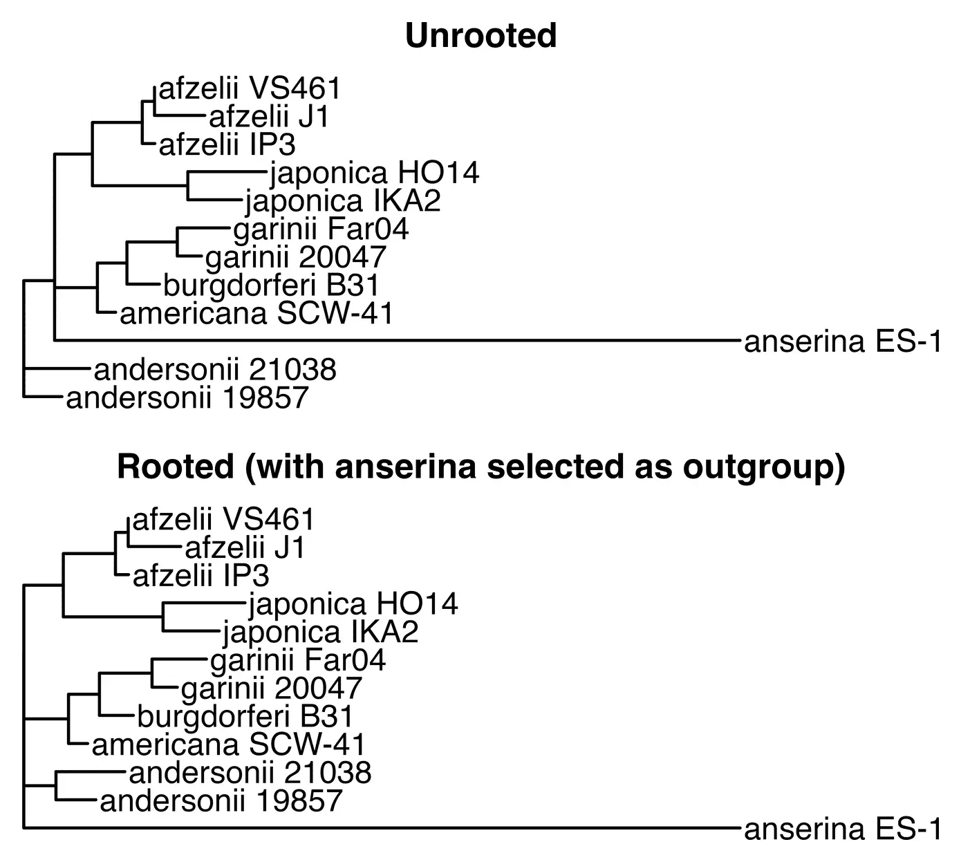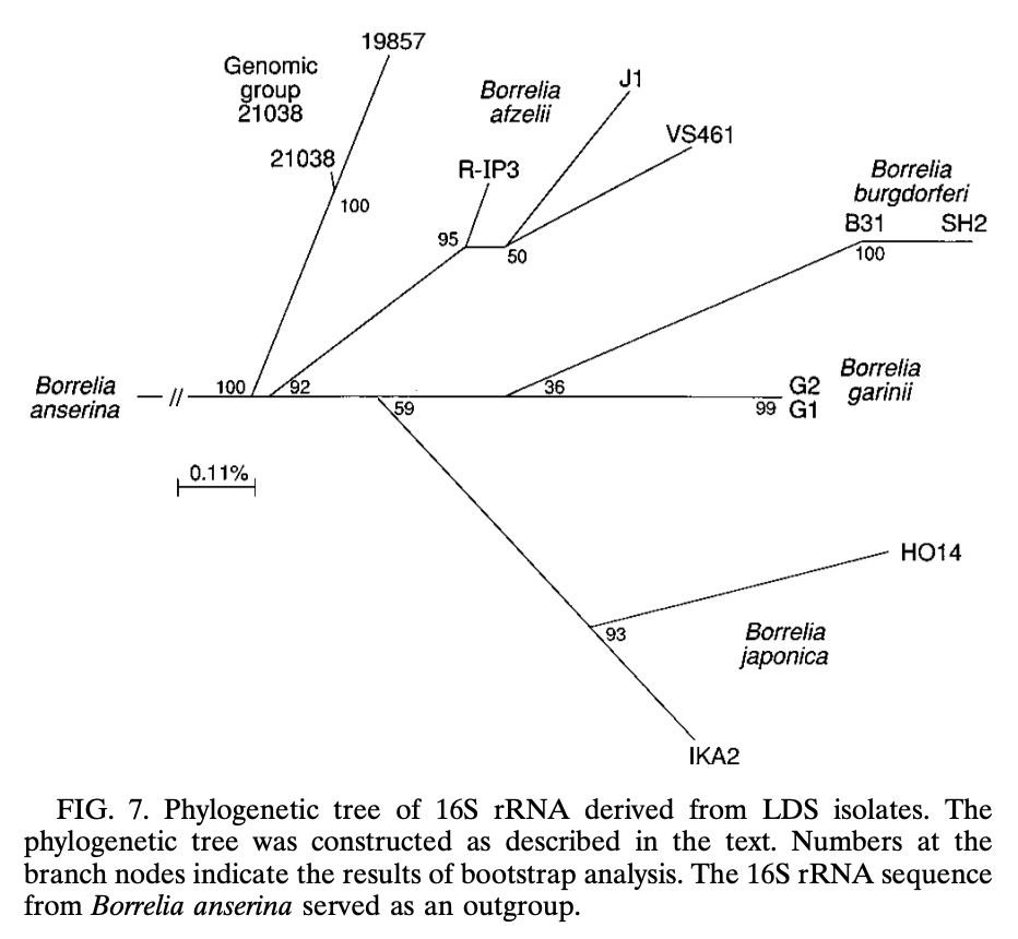 16S rRNA gene sequences (commonly used for bacterial phylogeny) show clear divergence. Studies from the early 1990s (e.g., Marconi et al., 1992) aligned B. burgdorferi sequences with those of B. anserina, B. hermsii, and others, revealing species-level differences sufficient to distinguish them phylogenetically. Typical 16S rRNA similarity between LB and RF Borrelia species is around 95-97% (implying ~3-5% divergence), though exact pairwise values for these two are not uniformly reported in summaries - distance matrices place B. anserina outside the LB cluster with significant branch lengths.