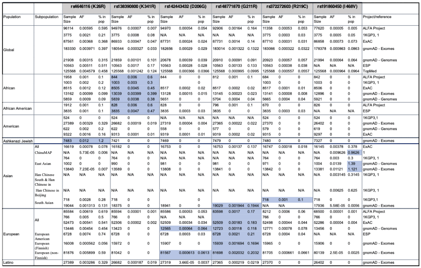 deleterious total ratio Amish 0 55378 0.0000000 Middle Eastern 0 19182 0.0000000 European (Finnish) 3 642848 0.0000047 East Asian 3 315700 0.0000095 South Asian 3 292408 0.0000103 European (non-Finnish) 61 4132214 0.0000148 Other 4 126818 0.0000315 Latino/Admixed American 35 927936 0.0000377 Ashkenazi Jewish 15 210912 0.0000711 African/African American 304 2516608 0.0001208