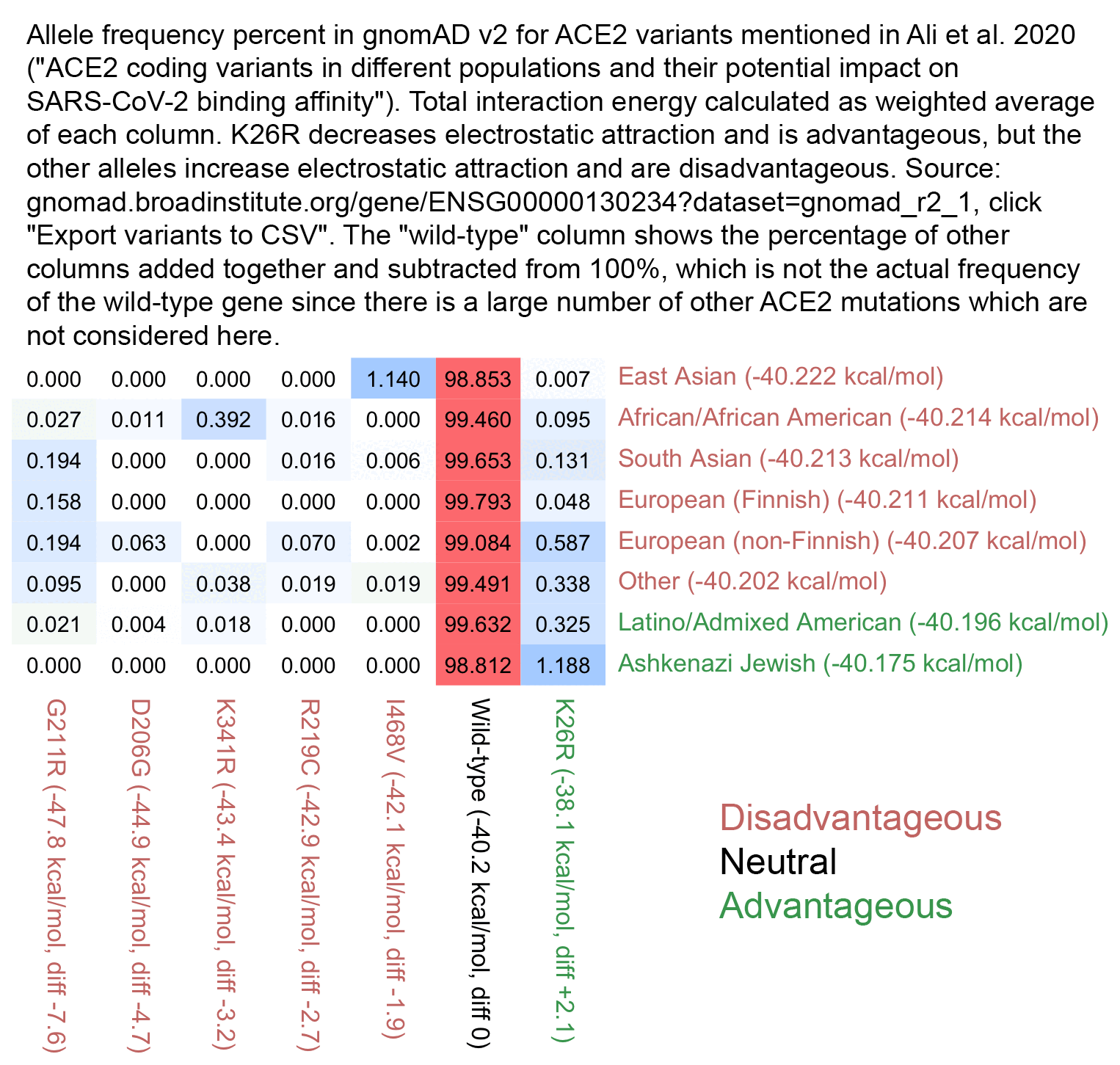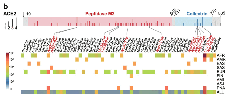In the figure above, East Asians are shown to have the highest frequency of the I468V allele, which was modeled as the least harmful of the 5 deleterious alleles, and which some people thought meant that East Asians would have the second-most advantageous mutation profile after Ashkenazis. But actually even though the I468V allele is modeled as only mildly deleterious in the paper, and even though only about 1.1% of East Asians have the allele at gnomAD v2, the other deleterious alleles analyzed in the paper are also so rare that if you calculate a weighted average of the frequency of each allele at gnomAD multiplied by the modeled interaction energy of each mutated form of ACE2, then East Asians end up having the lowest total interaction energy level, which might theoretically make them the most suspectible to COVID. But all 6 alleles listed in the paper are so rare that there's only a tiny range of variation in the weighted averages of the energy levels, so that they range from about -40.222 kcal/mol in East Asians to about -40.175 kcal/mol in Ashkenazis: