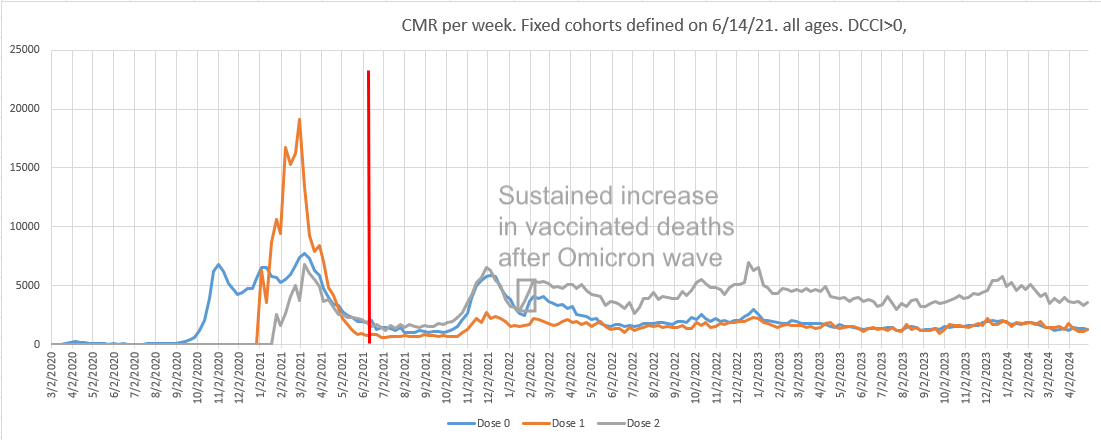 What is undeniable is that the average mortality rate doubles in just ONE year (from 5,000 to over 10,000) in a fixed age group (80+) where the average mortality rate for the entire group should be relatively constant over time (it's a zero sum game; all the cohorts should average to the same number each period). In one year, at the start of 2022, 90% are in Dose 2, hardly anyone is left in Dose 1, and the rest are unvaccinated. The bars for Dose 0 and Dose 2 are the same height (at 10,000). So the total mortality of the entire group is nearly double what it was a year ago and it was NOT driven by the unvaccinated. The unvaccinated mortality went DOWN and the vaccinated mortality went up.