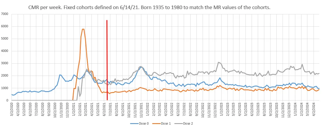 Check it out: flat line for Dose 1 (orange curve). And since Dose 1 cohort is small, leaving those people behind would create a massive effect, much larger than the impacts on Dose 2 because it's a transfer of an absolute number of people because HVE is a zero sum game on absolute counts.