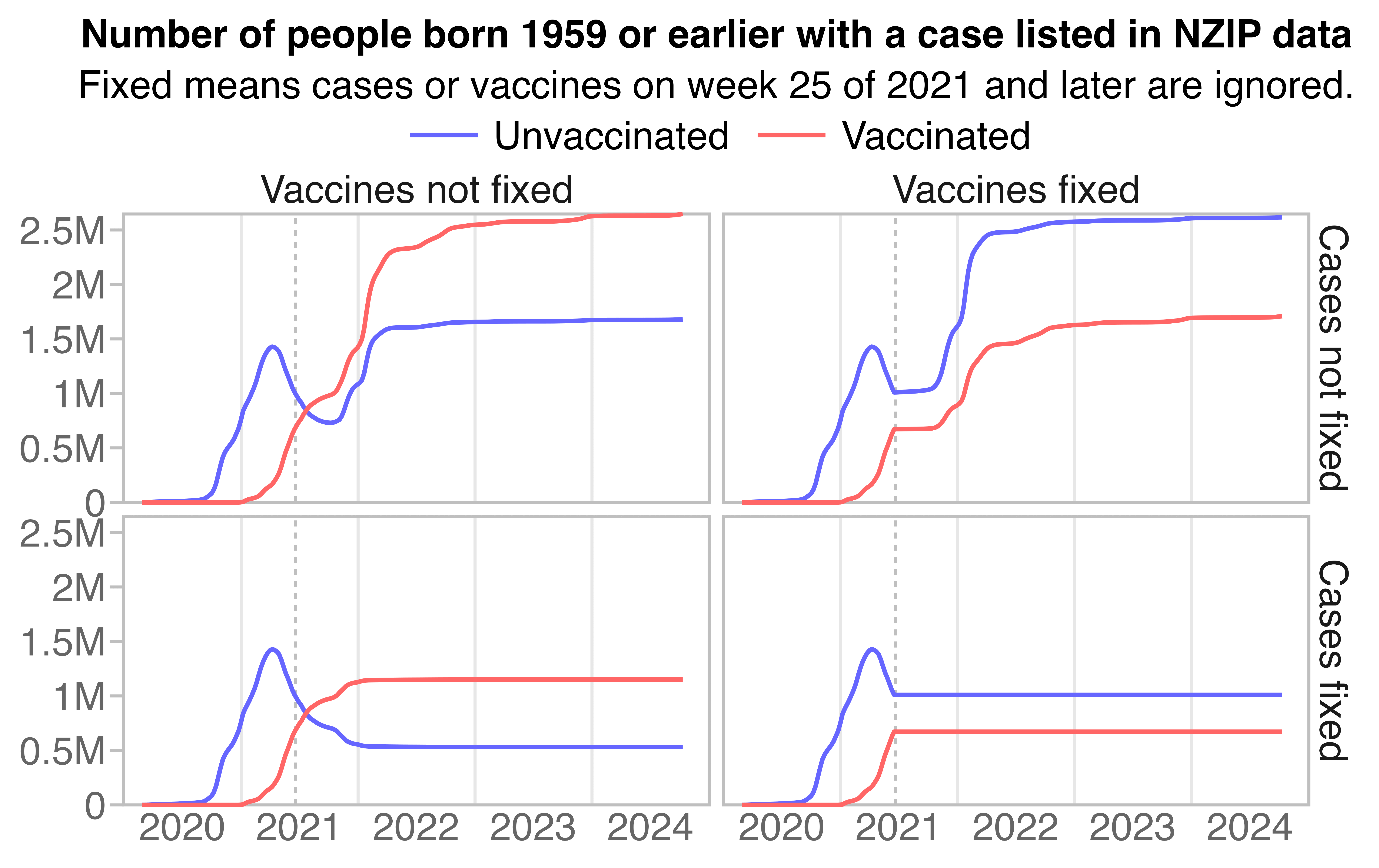 Kirsch ignored vaccine doses given on week 25 of 2021 or later. But the denominator he used to calculate his mortality rate was the number of people who had ever had a case, including people who had not yet had a case but who later ended up getting a case, which is similar to the value of the top right panel at the end of the x-axis in my next plot. He should've instead used the number of people who had had a case so far as the denominator, which is shown by the line in my top right panel. Or he should've excluded all people who didn't have a first case listed before on week 24 of 2021 or earlier, like in my bottom right panel: