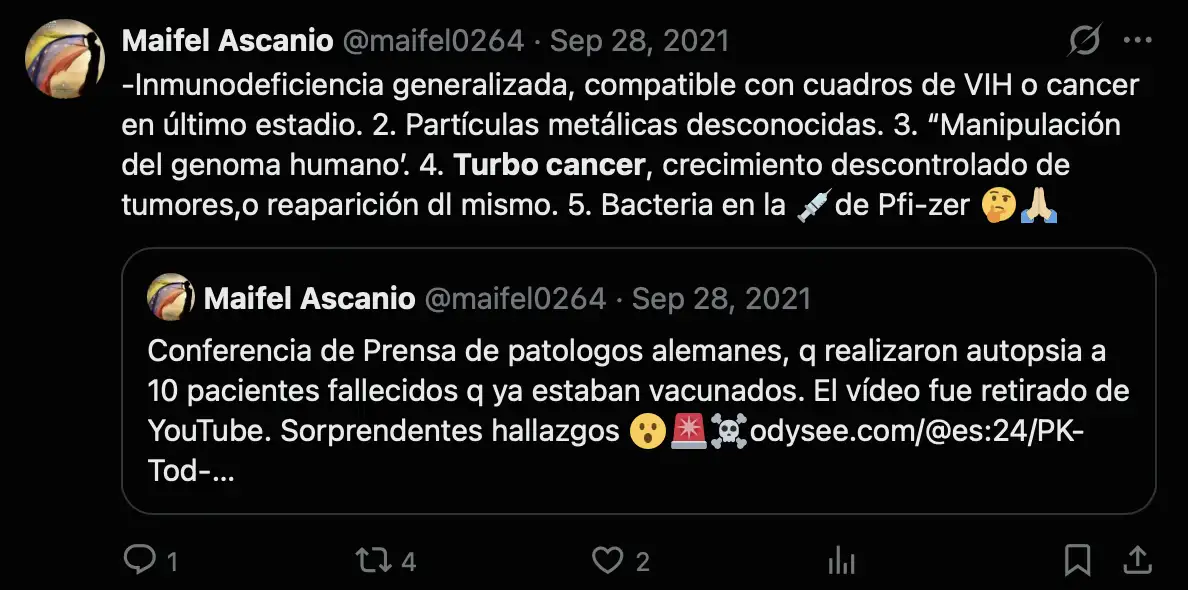 At time 8:27, Alex Bolland said this in the English dub: "If we look at the content of the vaccines, of course the spike proteins, mRNA, and graphene oxide - I've seen pictures of that, of groups, of people from Spain - I don't question this, whatever. I'm happy to be called - what do we say - what do you call them - conspiracy theorists, yes. I have also indications that there's mini-robots in the blood. The earliest time I heard of this was in 95 in a presentation from someone who was an expert. So I would say the people who are into this vaccination are 30 years ahead. Thousands of scientists must have worked on this." A bullet point in his slides suggested that vaccines contained a parasite called Treponasoma cruzi, even though he didn't discuss the parasite in his presentation: