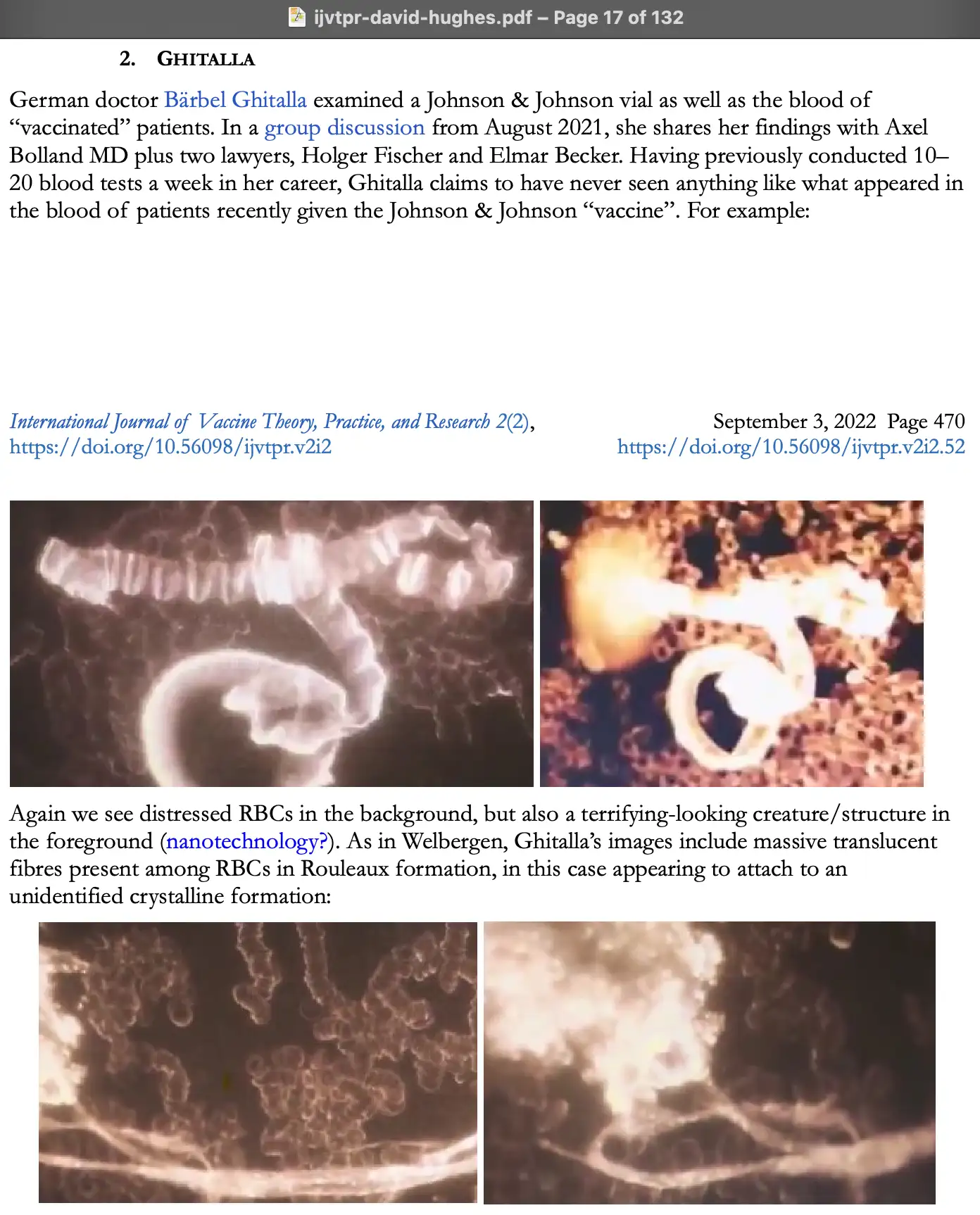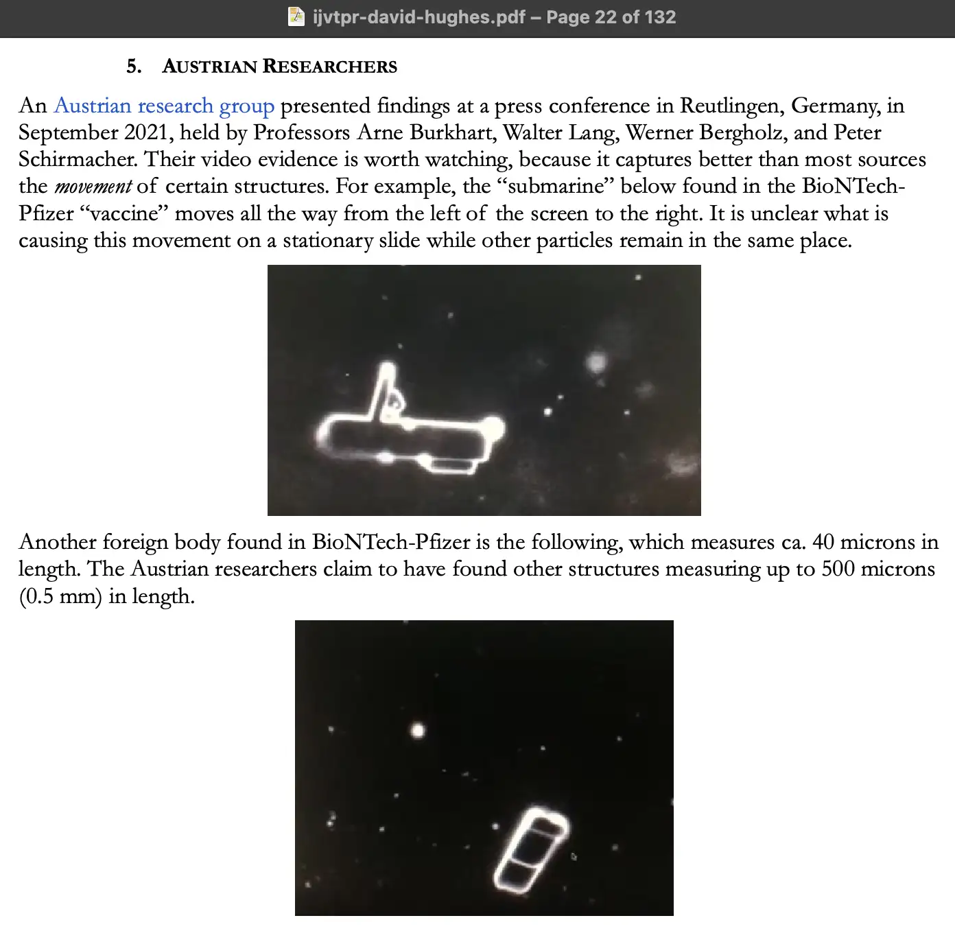 And shortly after that, a German team of pathologists had a very powerful conference that they recorded and uploaded. And that's well worth everybody looking at. And that was in two parts. In the first half, they were describing the post-mortem findings and people who died after vaccination. And they were reporting things that they'd never seen in their whole careers. And in the second half, they were talking about particles that had been found on microscopy of the vaccine itself. So we first told government at the end of September last year that this stuff was emerging.